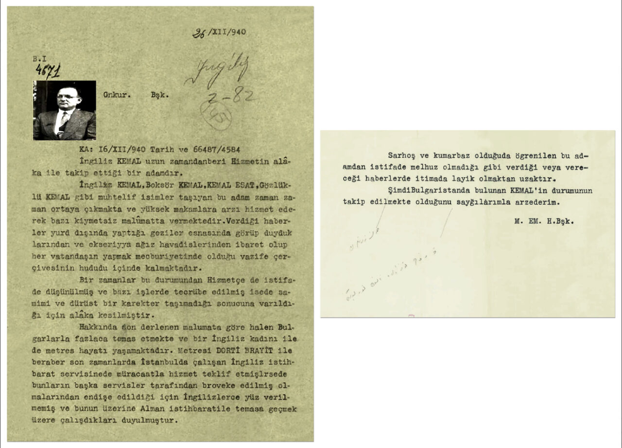 Hakkında dün derlenen malumata göre, halen Bulgarlarla fazlaca temas etmekte ve bir İngiliz kadını ile de metres hayatı yaşamaktadır. Metresi Dorti Brayit ile beraber son zamanlarda İstanbul’da çalışan İngiliz İstihbarat Servisi’ne de müracaatla hizmet teklif etmişlerse de bunların başka servisler tarafından provoke edilmiş olmalarından endişe edildiği için İngilizlerce yüz verilmemiş ve bunun üzerine Alman istihbaratı ile temasa geçmek üzere çalıştıkları duyulmuştur. Sarhoş ve kumarbaz olduğu da öğrenilen bu adamdan istifade melhuz olmadığı gibi verdiği veya vereceği haberler de itimada layık olmaktan uzaktır. Şimdi Bulgaristan’da bulunan Kemal’in durumunun takip edilmekte olduğunu saygılarımla arz ederim.”