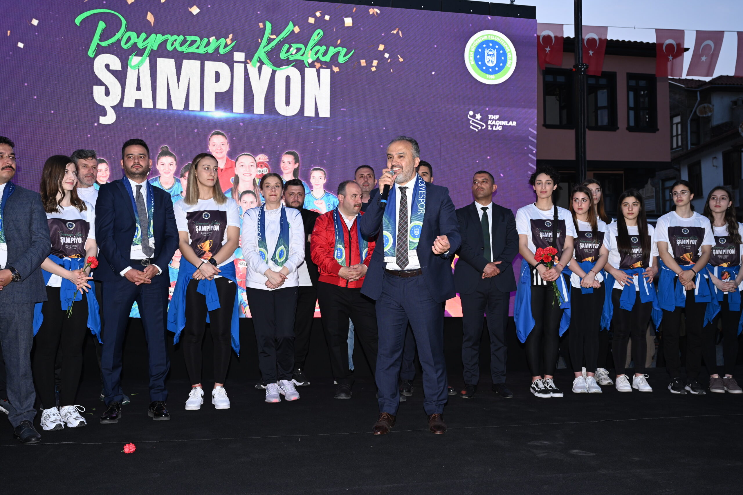 Poyrazın Kızları projesinin kendisine 3 yıl önce geldiğini hatırlatan Bursa Büyükşehir Belediye Başkanı Alinur Aktaş ise, “’Poyrazın Kızları sıkıntılı durumda. Mudanya Belediyesi ilgileniyor ama durumları belli değil’ dediler. Ben de ‘bünyemize almak ayıp olur. Böyle bir şeyi yapmayalım ama destek anlamında üzerimize düşeni yapalım’ dedim. Ancak 2 sene içinde bir arpa boyu yol alınmadı ve daha da geriye gitti süreç. Geçen sene bardak taşmak üzereydi ve devir teslimi yaptık. Kendimize bir hedef koyduk ve 2 yıl içinde Süper Lige çıkaracağız dedik. Ama bizim kızlar felaket. Daha birinci senenin sonunda çıktılar. Her bir kardeşimizi gözlerinden öpüyorum. 18 sporcumuzun 14 tanesinin Bursa orjinli olması bizim ayrıca gururumuz. Artık Süper Ligdeyiz. İnanıyorum ki Poyrazın Kızları Türkiye’de de Avrupa’da da çok daha sert esecek” diye konuştu.