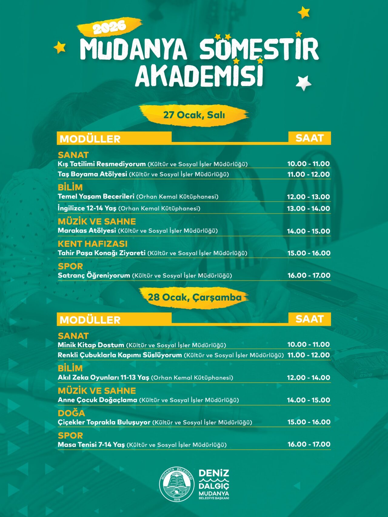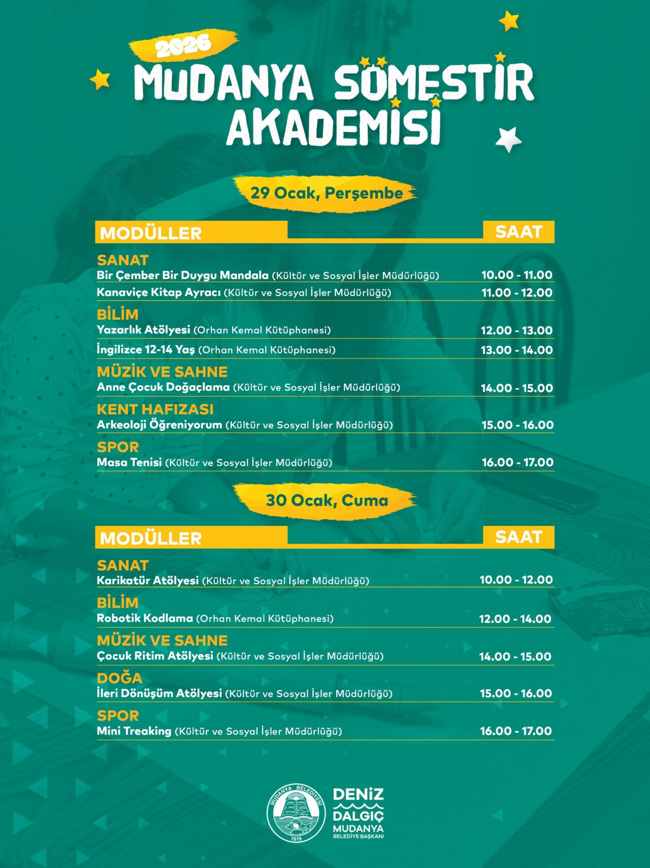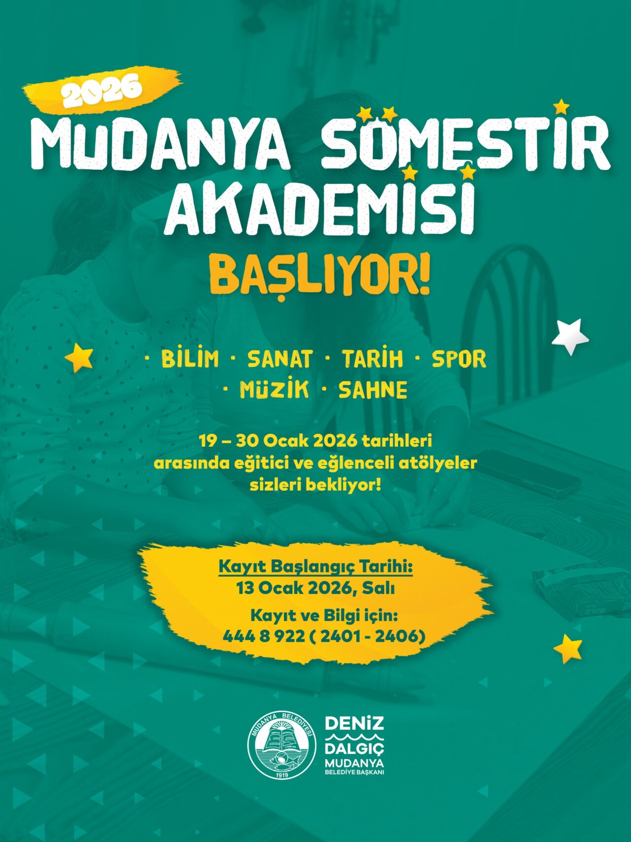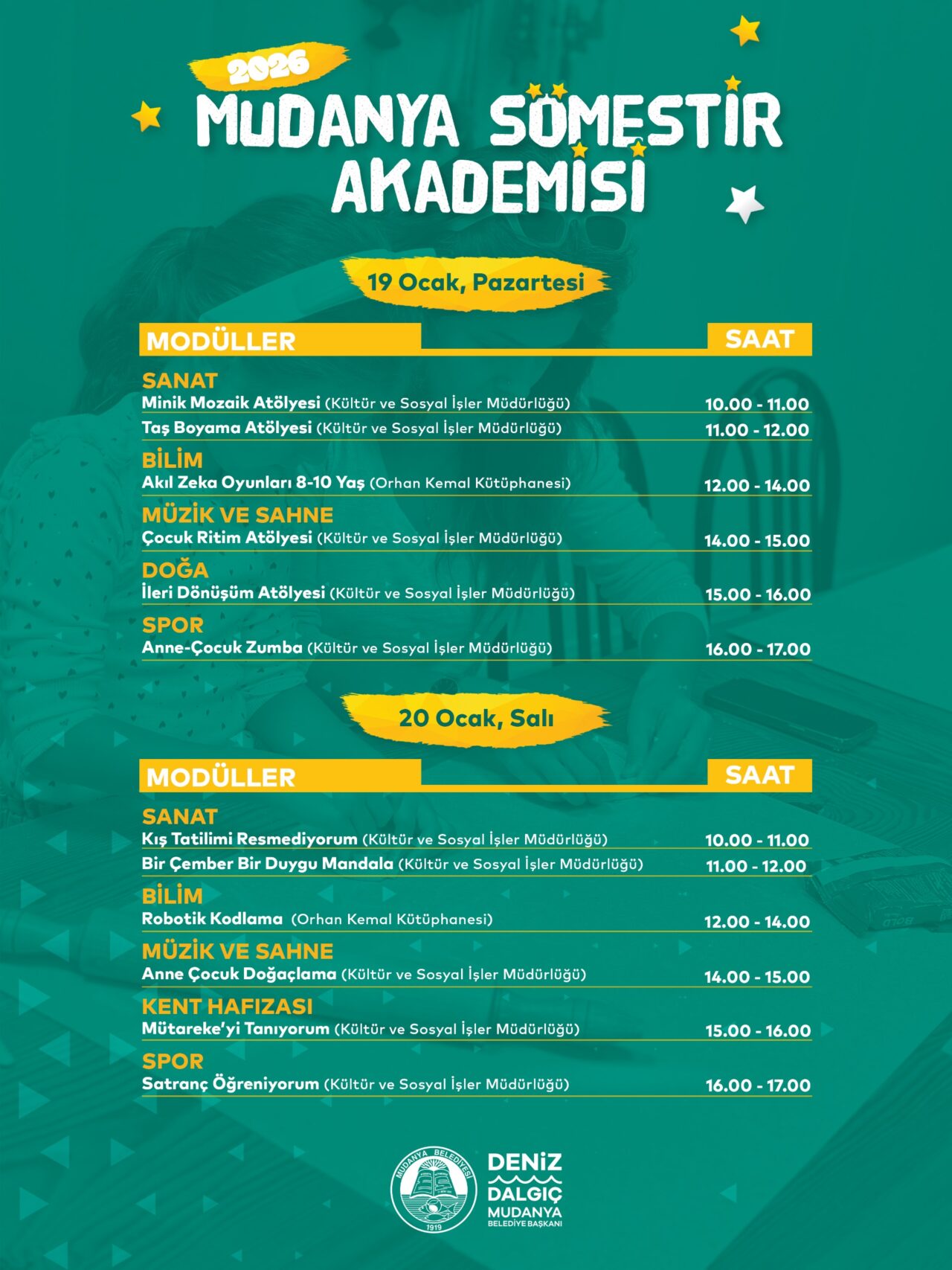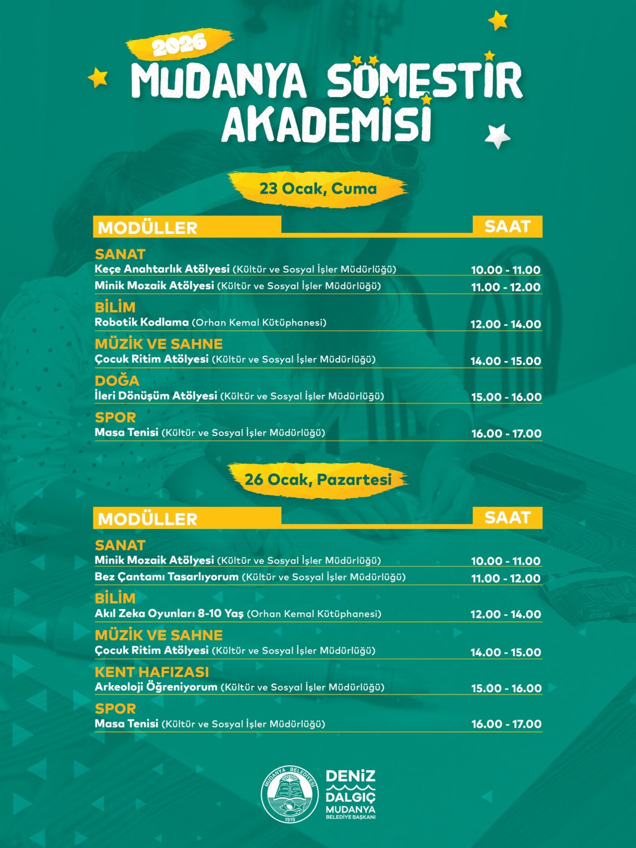 Mudanya Belediyesi, eğitim-öğretim yılının ilk dönemini tamamlayan öğrenciler için kapsamlı bir tatil programı hazırladı. 19–30 Ocak tarihleri arasında düzenlenecek olan Mudanya Sömestir Akademisi’nde her gün; Sanat, Bilim, Sahne ve Müzik, Doğa-Kent Hafızası ve Spor modülleri kapsamında sayısız atölye, ders ve gezi gerçekleştirilecek. Robotik kodlama, zeka oyunları, satranç, el sanatları, yazarlık, masa tenisi, ritim, İngilizce ve temel yaşam becerileri gibi birçok farklı atölyenin yer alacağı programda çocuklar, Mudanya’nın tarihi ve kültürel değerlerini de tanıma fırsatı bulacak.