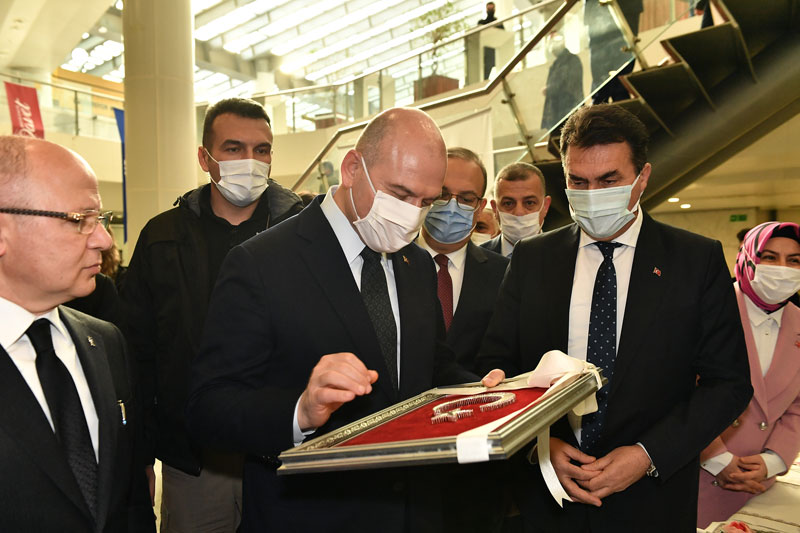 Osmangazi Belediyesi’nin katkılarıyla gerçekleştirilen toplantıda, İçişleri Bakanı Süleyman Soylu, gündeme ilişkin önemli açıklamalarda bulundu. Toplantı öncesinde Bakan Soylu, Osmangazi Belediyesi’nin salondaki standını ziyaret etti. OSMEK kursiyerlerinin el emeği ürünleri hakkında görevlilerden bilgi alan Bakan Soylu’ya Osmangazi Belediye Başkanı Mustafa Dündar, el işlemesi bir Türk Bayrağı tablosu hediye etti. Bakan Soylu, ayrıca Osmangazi Belediyesi’nin düzenlediği sempozyumlardan derlenen kitapları da ilgiyle inceledi.