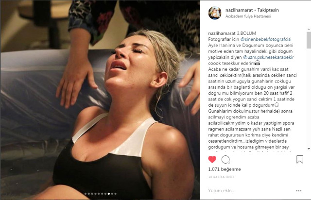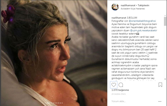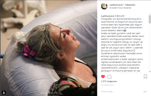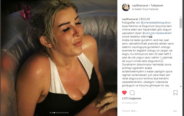 Paylaştığı fotoğrafları şu yorumu ekleyen Hamarat, “Acaba ne kadar günahım vardı kaç saat sancı çekicektim. (halk arasında çekilen suni saatin uzunluğuyla günahların çokluğu arasında bir bağlantı olduğu ön yargısı var doğru mu bilmiyorum ben 20 saat hafif 2 saat de çok yoğun sancı çektim 1 saatinde de suyun içinde kalıp doğurdum” ifadelerini kullandı.