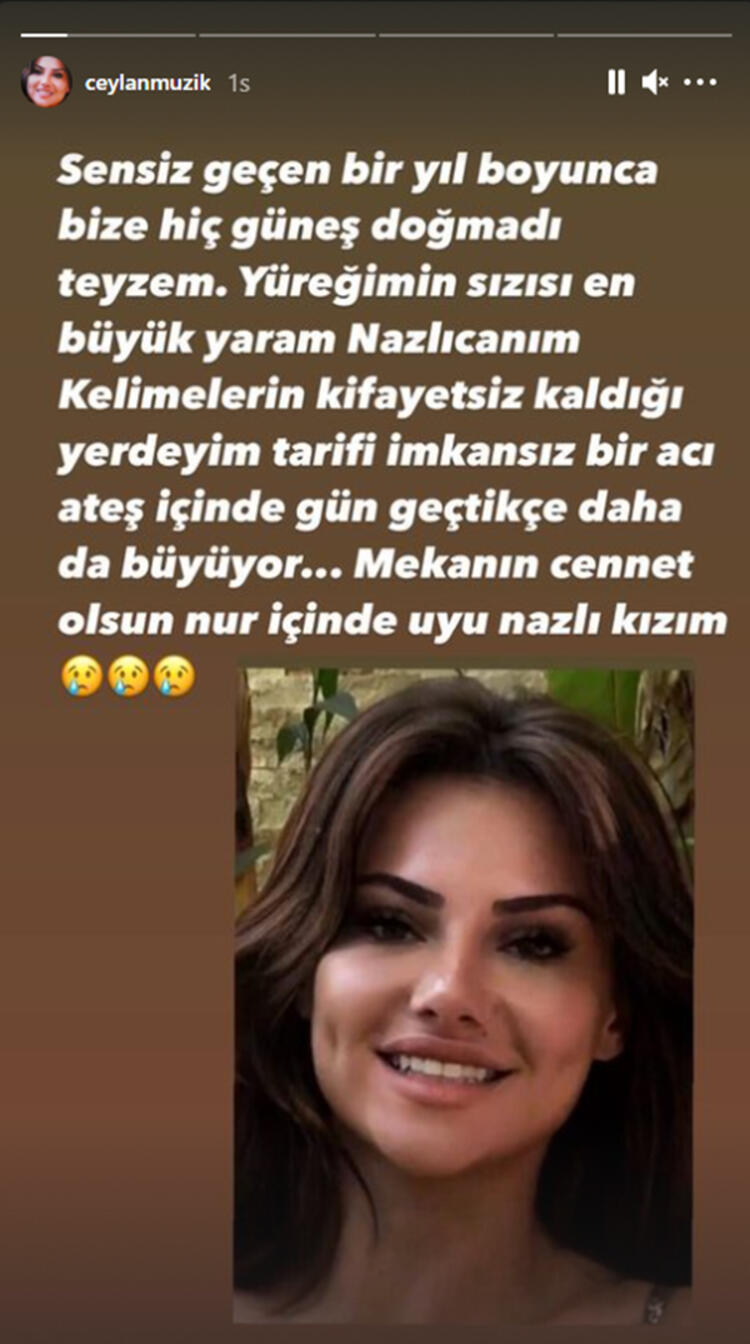 Ceylan, paylaşımında “Sensiz geçen bir yıl boyunca bize hiç güneş doğmadı teyzem. Yüreğimin sızısı en büyük yaram Nazlıcan’ım kelimelerin kifayetsiz kaldığı yerdeyim. Tarifi imkansız bir acı, ateş içinde gün geçtikçe daha da büyüyor. Mekanın cennet olsun, nur içinde uyu nazlı kızım” dedi.