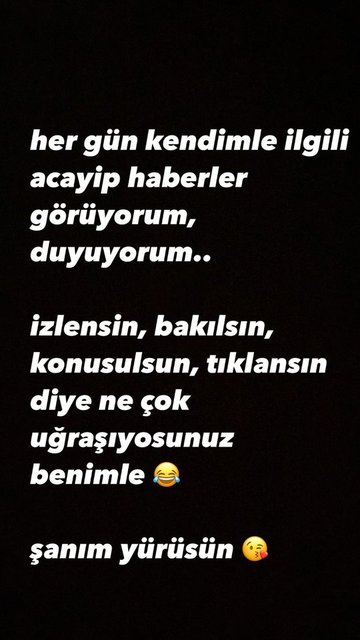 Esmersoy, “Her gün kendimle ilgili acayip haberler görüyorum, duyuyorum. İzlensin, bakılsın, konuşulsun, tıklansın diye ne çok uğraşıyorsunuz benimle. Şanım yürüsün” ifadelerini kullandı.