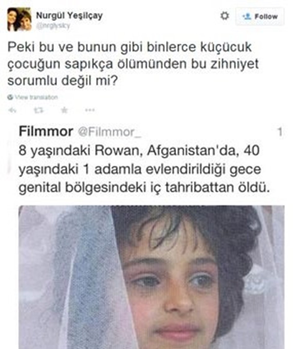 Daha sonra bir de fotoğraf paylaşan Yeşilçay, 40 yaşındaki bir adamla evlendiği gece genital bölgesindeki iç kanama nedeniyle hayatını kaybeden 8 yaşındaki Afganistanlı Rowan’ın fotoğrafını takipçilerine “Peki bu ve bunun gibi binlerce küçücük çocuğun sapıkça ölümünden bu zihniyet sorumlu değil mi?” notuyla iletti.