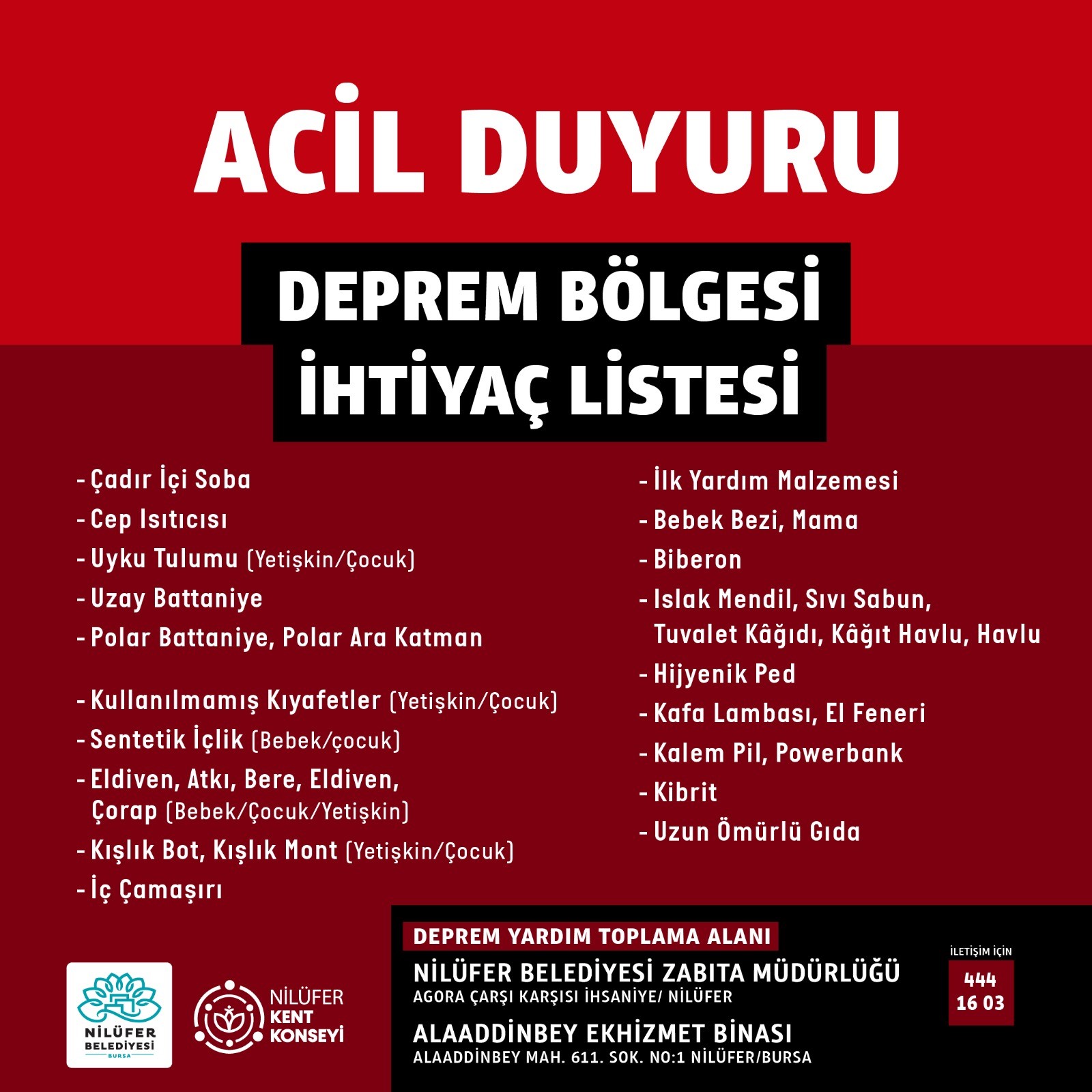 Nilüfer Belediyesi, Nilüfer Kent Konseyi ile birlikte tüm ülkeyi yasa boğan Kahramanmaraş’ın Pazarcık İlçesi’nde meydana gelen deprem sonrası yaraları sarmak adına seferber oldu. 10 ili etkileyen ve çok sayıda binanın yıkıldığı bölgede evlerine giremeyen vatandaşların ihtiyaçlarına el uzatmak isteyen Nilüfer Belediyesi yardım malzemeleri toplamaya başladı. Alaaddinbey Hizmet Binası ve İhsaniye Mahallesi’ndeki Agora Çarşısı karşısında bulunan Zabıta Müdürlüğü’nde toplanacak yardımlar hızla bölgeye gönderilecek. Yardım etmek isteyenler, ısıtıcı, battaniye, mont, kışlık bot, bebek maması, konserve, içme suyu, uzun ömürlü gıda başta olmak üzere ilk yardım ve temel ihtiyaç malzemelerini bu iki toplama merkezine bırakabilecek.
