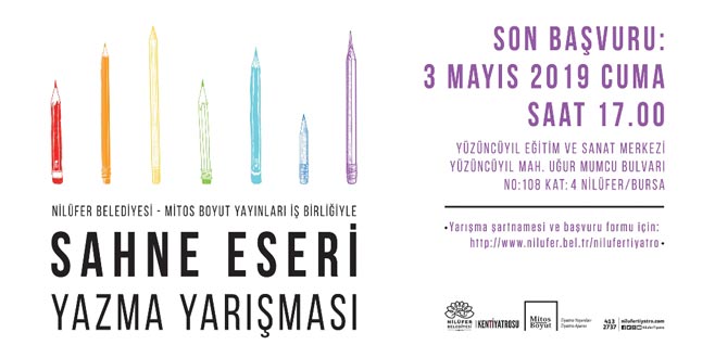 Organizasyon ve başvuru sürecinin sorumluluğunu Nilüfer Belediyesi Kent Tiyatrosu’nun üstlendiği yarışmaya katılmak isteyenler 3 Mayıs 2019 akşamına kadar başvuruda bulunabilir.