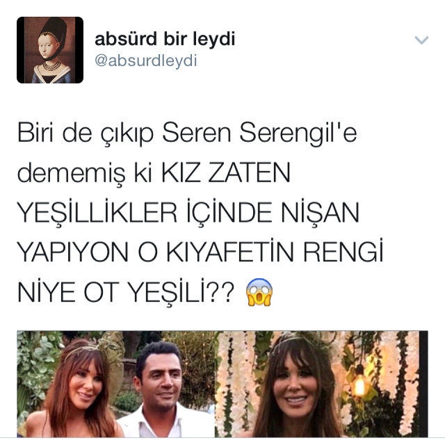 Nişan elbisesi olarak yeşil bir kıyafet tercih eden Serengil ve diğer konukların kıyafeti sosyal medyanın diline düştü. Geçtiğimiz günlerde adı iş adamı Murat Karabova ile anılan Deniz Seki’nin kıyafeti de çok konuşulanlar arasına girdi.