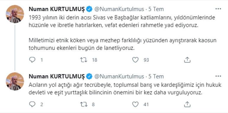 Sosyal medya hesabından açıklama yapan Numan Kurtulmuş, “1993 yılının iki derin acısı Sivas ve Başbağlar katliamlarını, yıldönümlerinde hüzünle ve ibretle hatırlarken, vefat edenleri rahmetle yad ediyoruz.