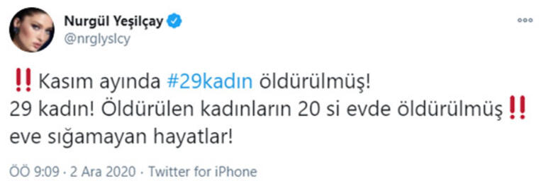 Geride bıraktığımız kasım ayında 29 kadının cinayete kurban gittiği bilgisini Twitter hesabında paylaşan Nurgül Yeşilçay, tepkisini şu sözlerle dile getirdi: