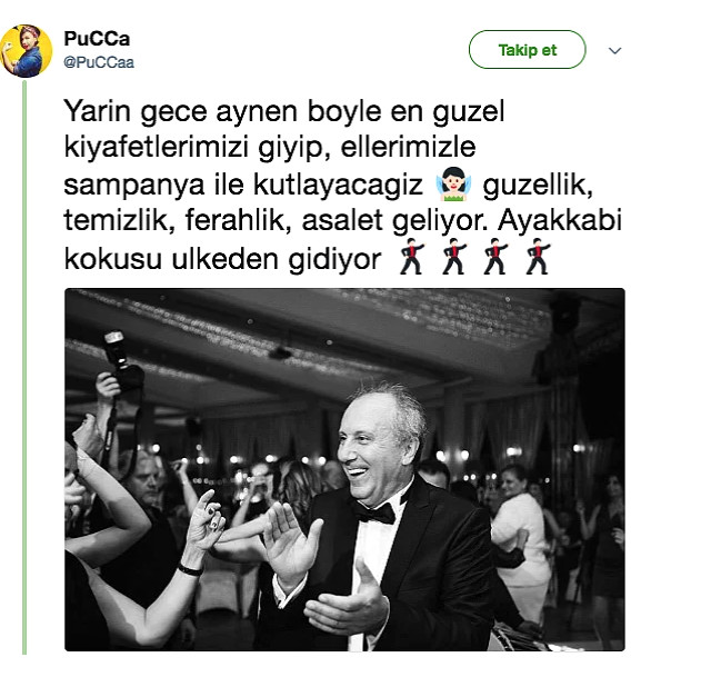 Muharrem İnce’nin bir resepsiyonda çekilen fotoğrafını “Yarın gece aynen böyle en güzel kıyafetlerimizi giyip, ellerimizle şampanya ile kutlayacağız.