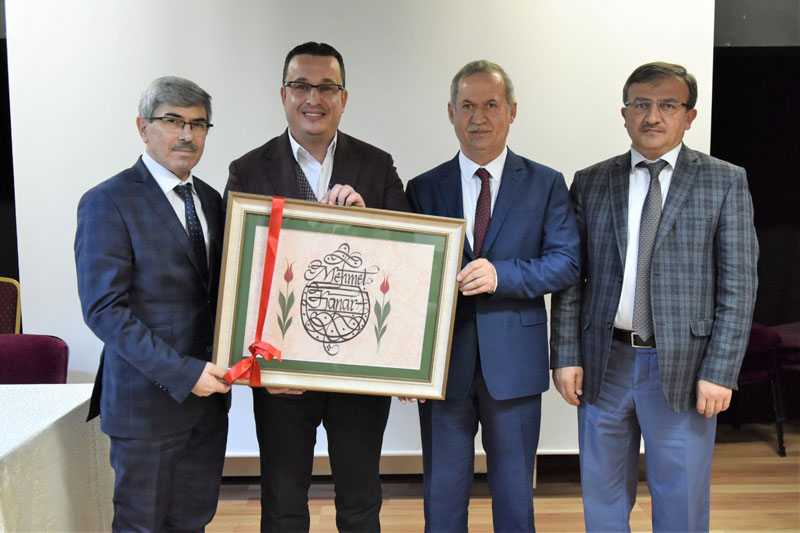Kariyer Günü’nün sonunda İlçe Milli Eğitim Müdürü Mustafa Efe tarafından kendisine hat sanatıyla hazırlanan Mehmet Kanar yazılı tablo takdim edildi.