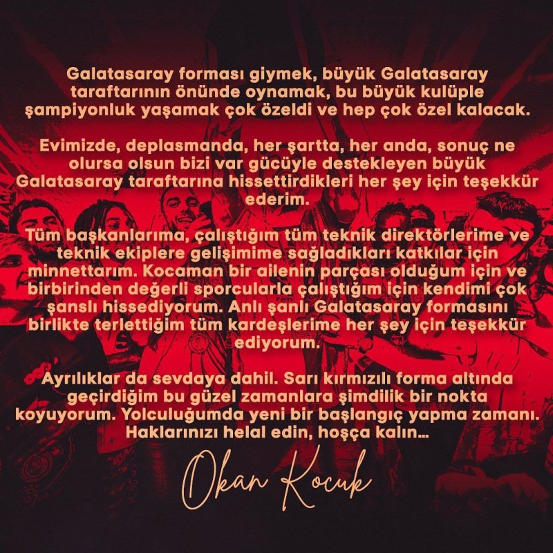 Sarı-kırmızı ekip de Okan Kocuk için sosyal medya hesabından teşekkür mesajı paylaştı. Paylaşımda, “Galatasaray çatısı altında yaşadığımız tüm başarılardaki katkın ve emeğin için teşekkür ediyoruz Okan. Bundan sonraki geleceğinde ve kariyerinde başarılar diliyoruz!” ifadeleri kullanıldı.
