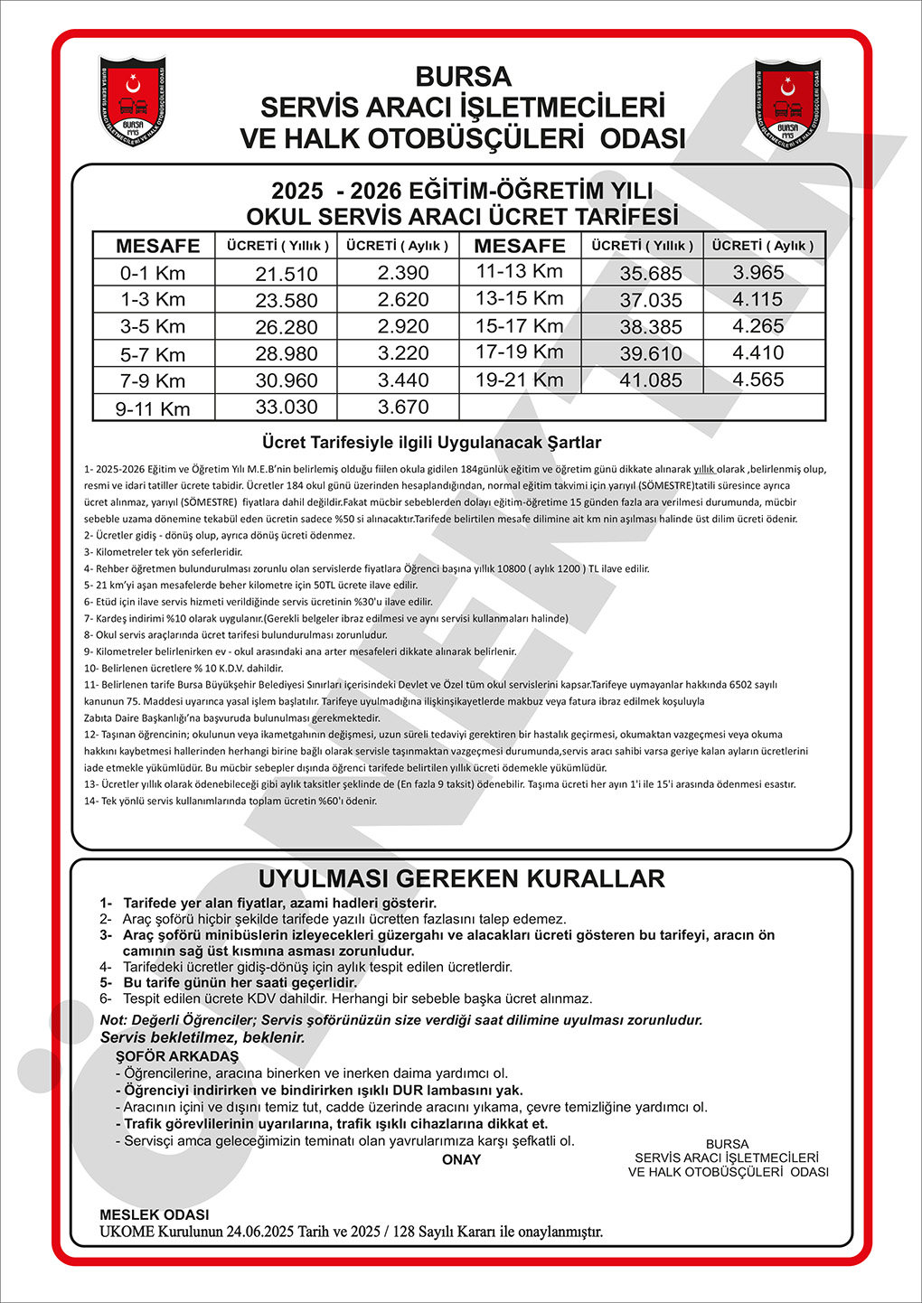 24 Haziran’da UKOME tarafından alınan kararla yeni eğitim-öğretim yılında okul servis ücretlerindeki yeni tarifeler şu şekilde oluştu: