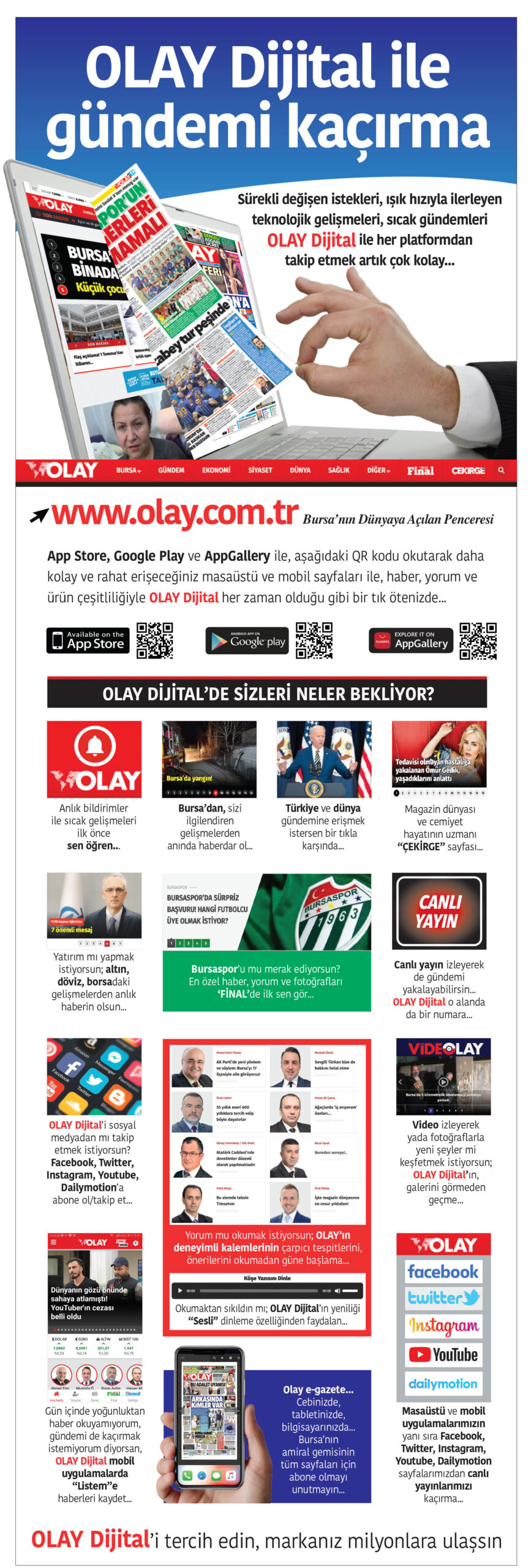 App Store, Google Play ve AppGallery ile, QR kodu okutarak da sizlerin kolay ve rahat erişeceğiniz masaüstü ve mobil sayfaları ile, haber, yorum ve ürün çeşitliliğiyle OLAY Dijital her zaman olduğu gibi bir tık ötenizde…