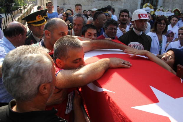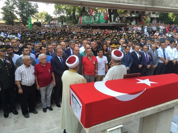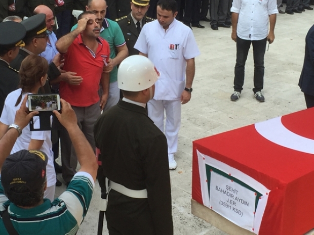 Bahadır Aydın’ı Ulucami’de mahşeri bir kalabalık bekliyordu. Binlerce Bursalı, şehide son görevlerini yerine getirmek için Ulucami’nin avlusunu ve Atatürk Caddesi’ni saatler öncesinden doldurdu. Kapalıçarşı bayraklarla donatılırken, esnaf da işyerlerini kapatarak törene katıldı. Atatürk Caddesi trafiğe kapatılırken, cenaze törenine, vatandaşlarla birlikte Sağlık Bakanı Dr. Mehmet Müezzinoğlu, Vali Münir Karaloğlu, AKP, CHP, MHP milletvekilleri, ilçe belediye başkanları, siyasi partilerin il başkanları katıldı. Cami avlusunu dolduran onbinler, ‘Şehitler Ölmez, Vatan Bölünmez’, ‘Meclis’te PKK İstemiyoruz’, ‘Ne Mutlu Türk’üm Diyene’ sloganları attı.