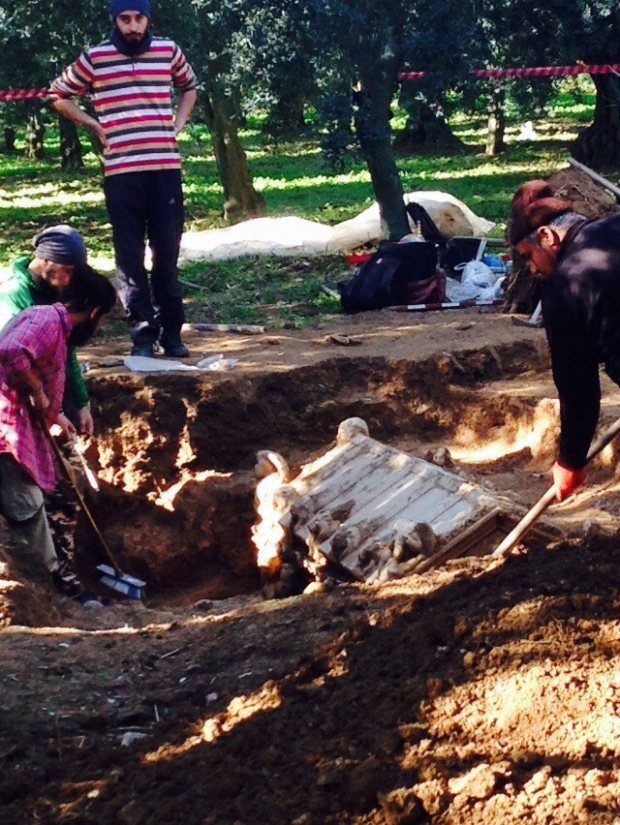 Edinilen bilgiye göre, H.S. ve ailesi, dün zeytin toplamak için tarlasına gitti. Bir ağacın altında mermer kütlesi gören tarla sahipleri durumu jandarmaya bildirdi. Müzeden gelen ekiplerle zeytinlikte yapılan incelemede, 7 ton ağırlığında bir mermer lahit olduğu tespit edildi. İki gündür yapılan kazılarda lahdin henüz yarısı gün yüzüne çıkarıldı. Yetkililer, kazıların iki gün daha sürebileceğini belirtti.