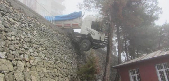 Karaman’ın Ermenek İlçesi’nde TIR’ın havada asılı kalması, yaklaşık 2 metre aşağısındaki yaklaşık 500 öğrencisi bulunan okulun üstüne düşmesini engelledi. Facianın eşiğinden dönülen kazada şans eseri ölen ve yaralanan olmadı. Kaza anı bir işyerinin güvenlik kamerası ile görüntülendi.