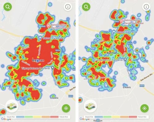 6 Temmuz ve 8 Ağustos tarihlerinde alınan iki harita görüntüsü, durumun ciddiyetini gözler önüne serdi. Son 1 aylık sürede Batman haritasının neredeyse tamamı ‘kırmızı’ denge büründü. Kent merkezinin yarını sıra ilçelerde de durum farklı değil. Kozluk ve Sason ilçesinde son 24 saatte tam 16 adres karantinaya alındı. Batman’ın Kozluk ilçesinde 14, Sason ilçesinde de ise 2 evde yeni tip koronavirüs tedbirleri kapsamında karantina uygulanmaya başlandı.