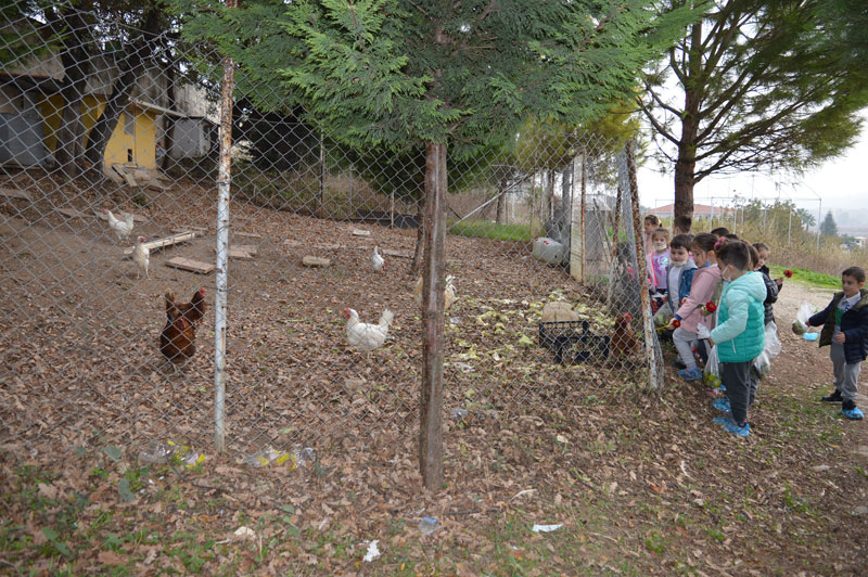 Aynı zamanda ekolojik tarım alanının yanındaki kümeste yaşayan hayvanları gözlemleyen öğrenciler horoz ve tavukların hummalı bir şekilde yiyecek aramalarına solucan avlamalarına tanık oldular.