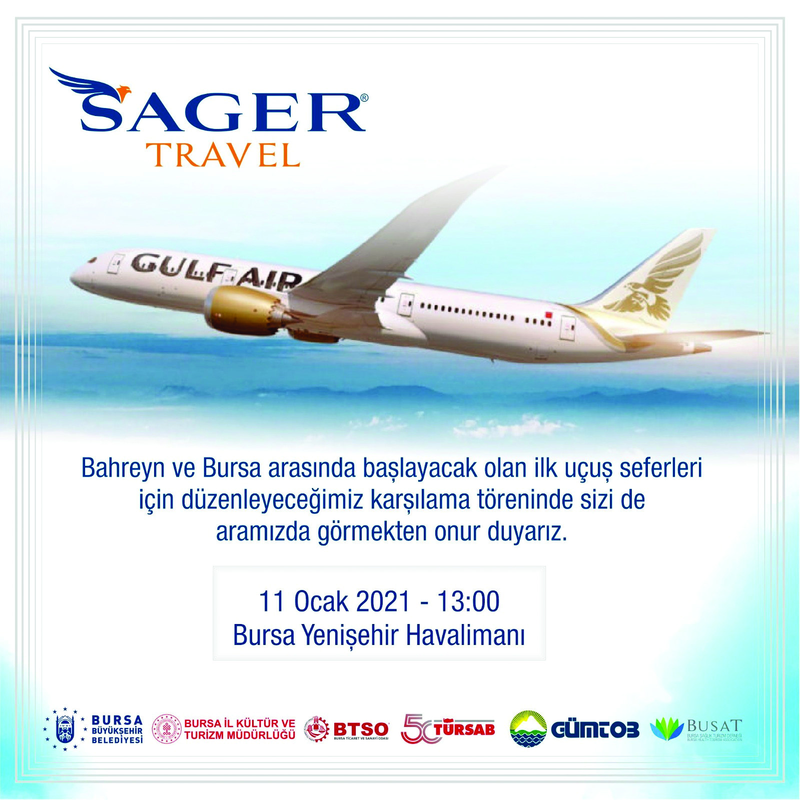 11 Ocak’ta Yenişehir Havalimanı’na seferleri yıl boyu sürecek, Bahreyn’den turist kafileleri gelmeye başlıyor. Sager Travel’in yoğun çalışmaları sonucunda Yenişehir Havaalanı’na inecek kafilede sağlık turizmi için doğrudan Bursa’ya gelen insanlar bulunuyor. Yıllardır konuşulan ancak büyük hacimlere ulaşmayan turist potansiyeli, genç bir iş insanı tarafından tetiklenmiş durumda. 2003 yılından bu yana aile şirketi olarak başlayıp Sager Travel adıyla faaliyetlerine devam eden şirket 55 personeliyle kapsamlı organizasyonlar gerçekleştiriyor.