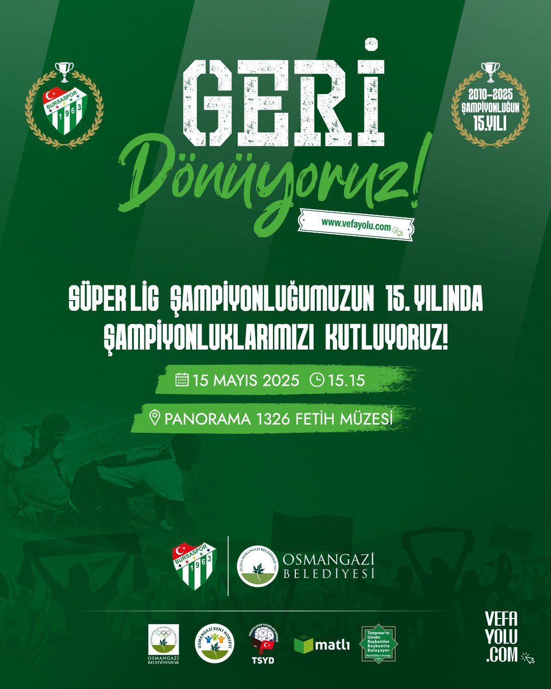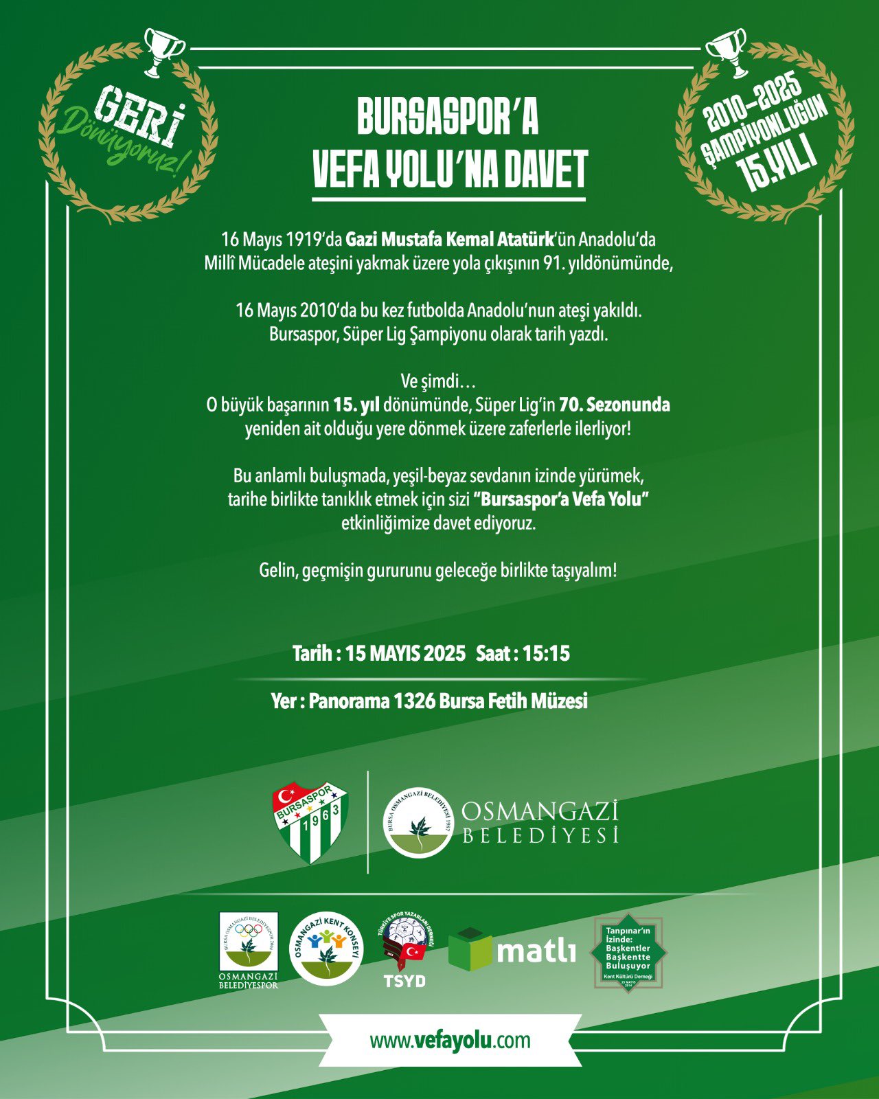 Bursaspor’un Süper Lig şampiyonluğunun 15. yılında, yeşil-beyaz sevdamızla “Vefa Yolu” etkinliğinde buluşuyoruz.