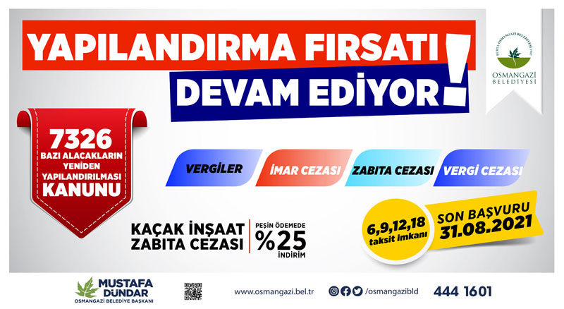 Vergi ve Diğer Bazı Alacakların Yeniden Yapılandırılması ile Bazı Kanunlarda Değişiklik Yapılmasına İlişkin 7326 Sayılı Kanun yürürlüğe girmesinin ardından, Osmangazi Belediyesi’ne borcu vatandaşlara önemli oranda ödeme kolaylıkları sunuluyor.