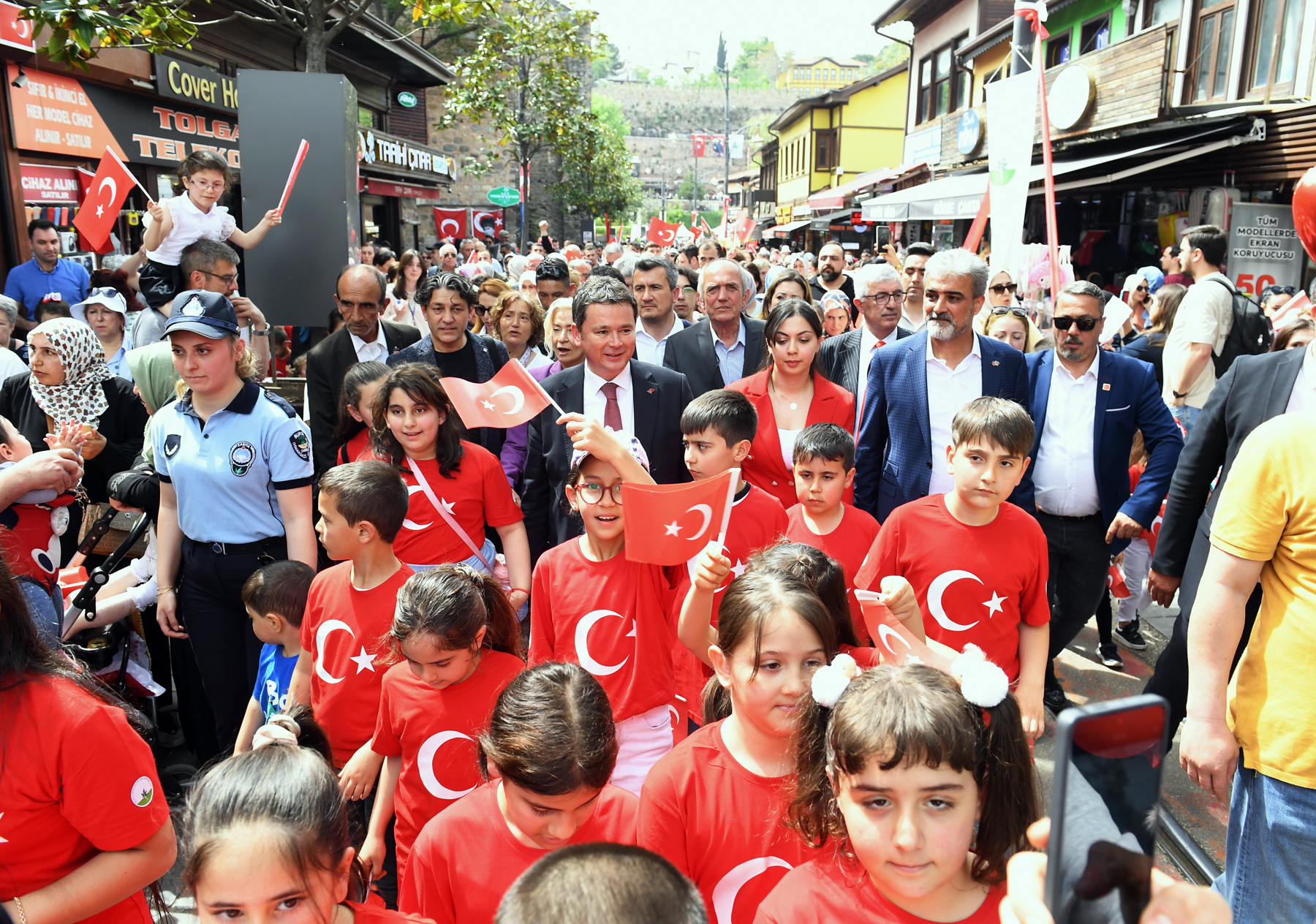 Sadi Etkeser İlkokulu öğrencilerinin bando ve halk oyunları gösterisinin ardından marşlar eşliğinde kortej yürüyüşüne geçildi. Başkan Erkan Aydın, çocuklar ve aileleriyle birlikte Zafer Plaza Meydanı’ndan Cumhuriyet Caddesi boyunca çocuk bandosu eşliğinde marşlar söyleyip, ay yıldızlı bayrakları sallayarak coşkulu bir yürüyüş gerçekleştirdi. Esnaf ve vatandaşların da büyük ilgi gösterdiği kortej yürüyüşü Abdal Meydanı’nda son buldu.