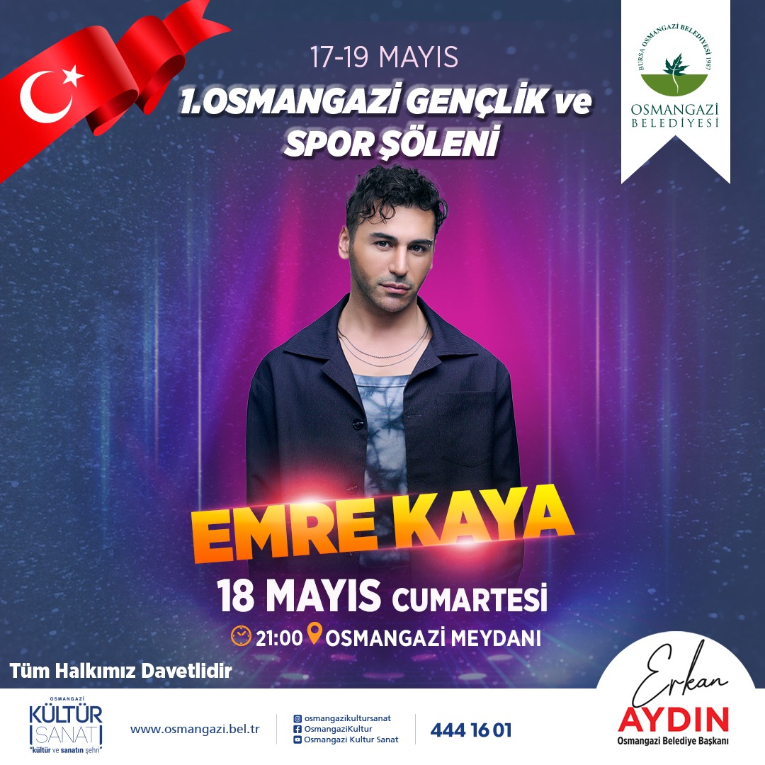 19 Mayıs Atatürk’ü Anma, Gençlik ve Spor Bayramı kutlamaları, 18 Mayıs Cumartesi günü de dolu dolu devam edecek. Sokak basketbolu turnuvası ve masa tenisi turnuvası gibi sportif etkinliklerin yanı sıra eğlence dolu etkinlikler ile devam edecek olan 1. Osmangazi Gençlik ve Spor Şöleni’nin ikinci gününde Türk pop müziğinin sevilen ismi Emre Kaya, Osmangazi Meydanı’nı dolduran binlerce genç için sahnede olacak. Ünlü şarkıcının seslendireceği şarkılara eşlik edecek olan gençler, 19 Mayıs coşkusunu doyasıya yaşamanın keyfine varacak.