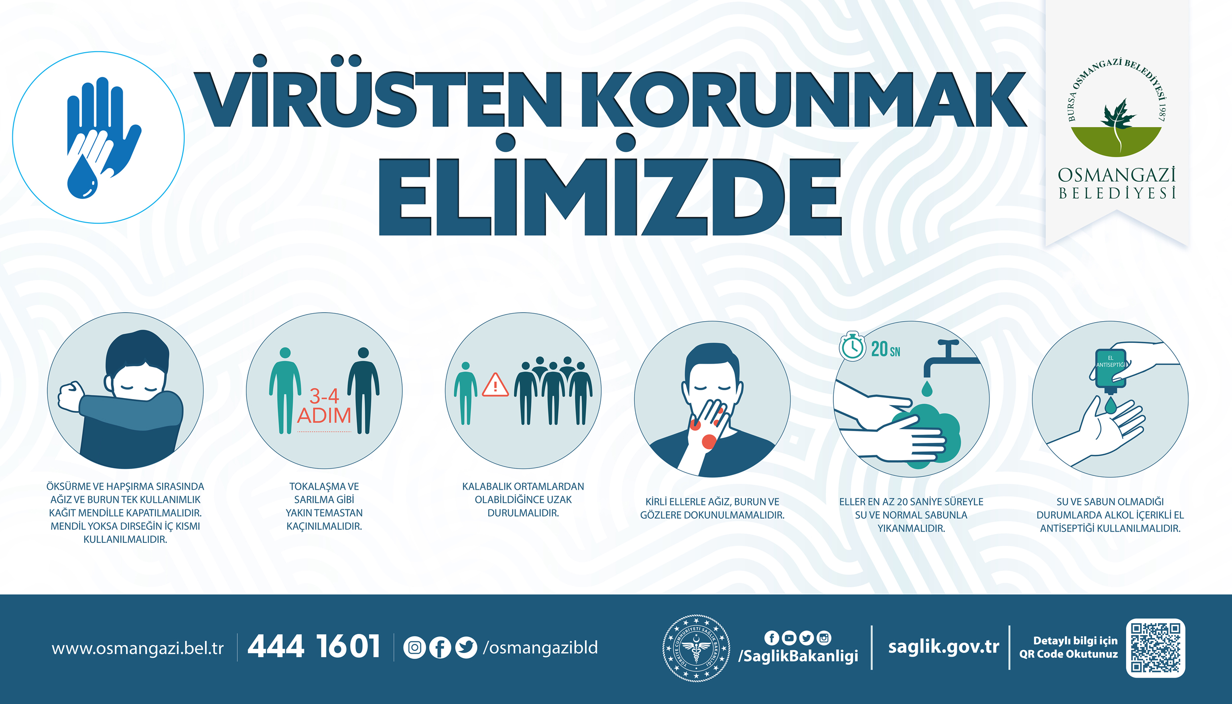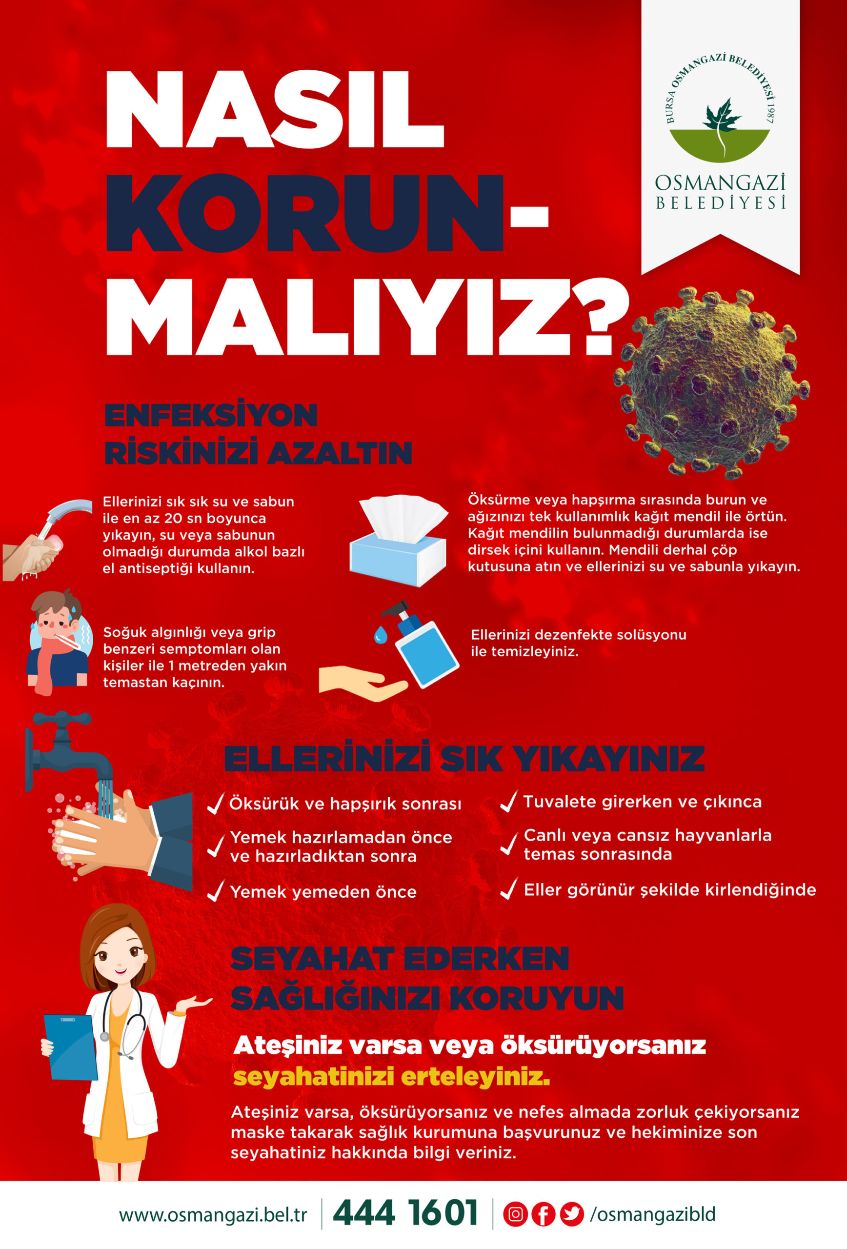 Hükümetimizin Coronavirüs (COVID-19) için almış olduğu sağlık önlemleri kapsamında, Osmangazi Belediyemiz’e gelmeden işlemlerinizi, 4441601 NO’lu Çağrı Merkezi, www.osmangazi.bel.tr, E-Osmangazi veya E-Devlet platformundan kolayca yapabileceğini bildiririz.