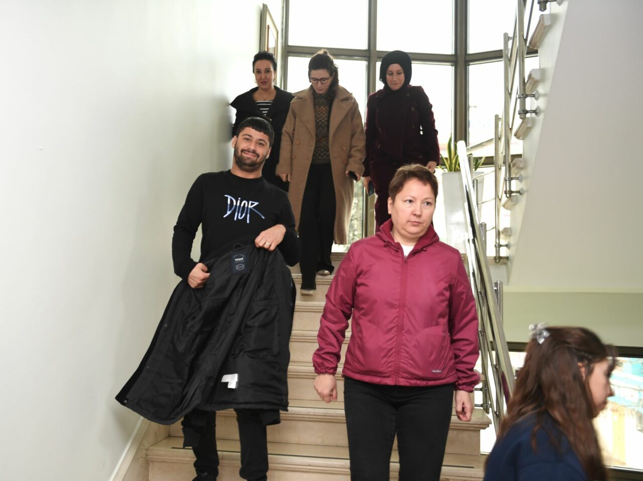 Belediyede bulunan tüm personeller aynı anda çalışma masalarının kenarlarına bu hareketi yaparak deprem anında yapılması gerekenleri doğru bir şekilde uyguladı.