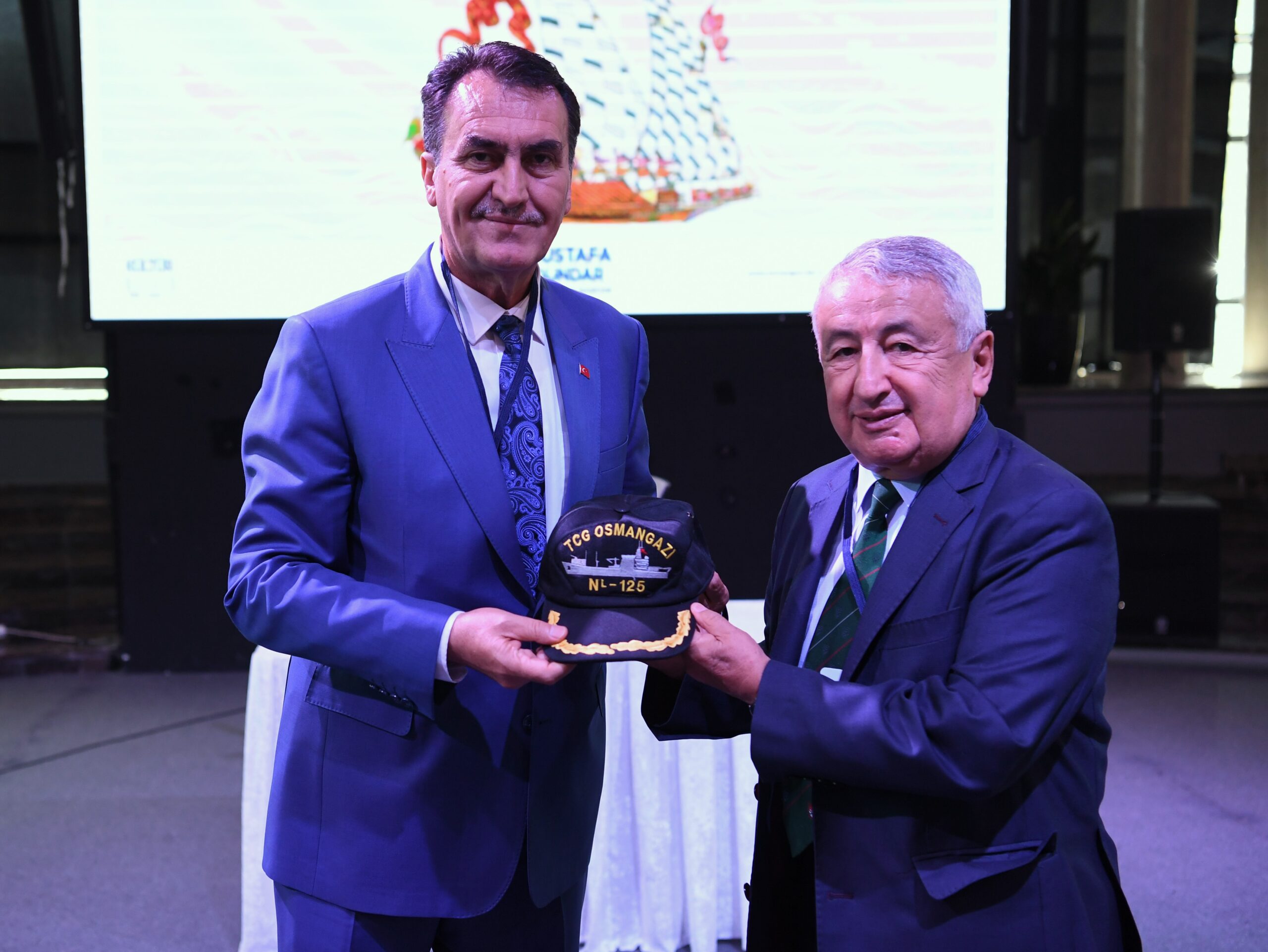 Emekli Oramiral Muzaffer Metin Ataç, günün anısına Başkan Dündar’a TCG Osmangazi (NL-125) çıkarma gemisinin şapkasını hediye etti.