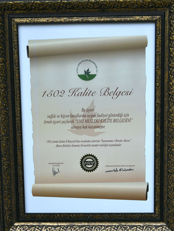 Dünyada ilk kalite belgesinin, Sultan 2. Bayezid döneminde 1502 yılında uygulanmaya başlandığını ifade eden Osmangazi Belediye Başkanı Mustafa Dündar, “İlk Belediye Kanunu olan Kanunname-i İhtisab-ı Bursa (Bursa Belediyeler Kanunu) ile gıda ürünleri, sanayi ürünleri, deri ve tekstil ürünleri, tarım ve orman ürünleri gibi pek çok ürünün standardı, daha 1502 yılında belirlenip uygulanmış. Bu işin ilk başlangıç noktası Bursa. Bizler de Osmangazi Belediyesi olarak kriterleri uygun olan iş yerlerine bu belgeyi veriyoruz. Belgeyle birlikte amacımız hizmet kalitesini artırmak, bu bilinci devam ettirmek” dedi.