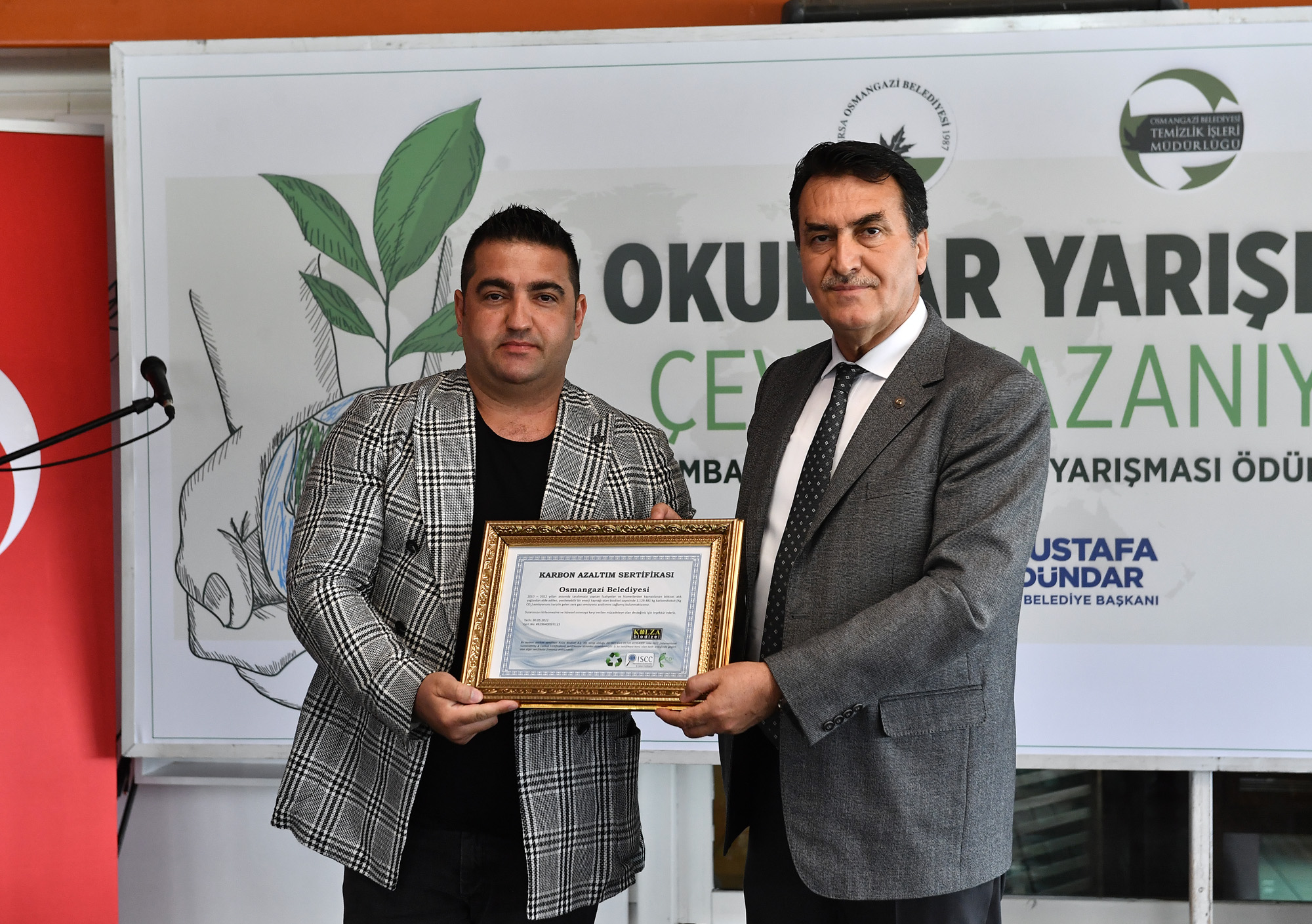 Konuşmaların ardından Kolza Biodizel Bölge Sorumlusu Haydar Eroğlu, karbon ayak izini azaltmaya yönelik çalışmalarından dolayı Osmangazi Belediye Başkanı Mustafa Dündar’a “Karbon Azaltım Sertifikası” verdi.