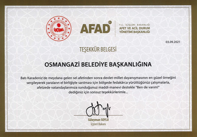 Bakan Soylu’nun teşekkür belgesinde, “Batı Karadeniz’de meydana gelen sel afetinden sonra devlet-millet dayanışmasının en güzel örneğini sergileyerek yaraların el birliğiyle sarılması için bölgede fedakârca yürüttüğünüz çalışmalarla afetzede vatandaşlarımıza sunduğunuz maddi-manevi destekle ‘Ben de varım!” dediğiniz için sonsuz teşekkürlerimle” ifadeleri yer aldı.