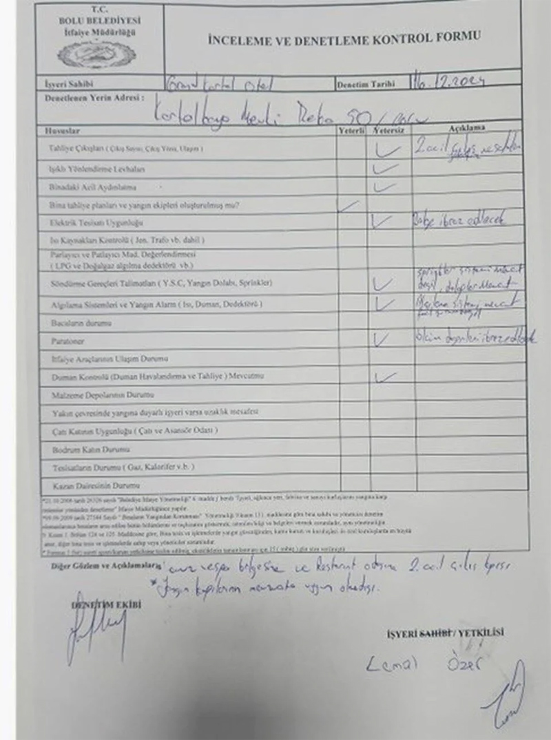 Dilekçe üzerine belediye ekipleri otel binasında inceleme yapıyor. İnceleme sonucunda otel binası içinde 8 kusur tespit ediliyor. Bu tespitlerde yangına ve can kaybına neden olacak bütün eksiklikler sıralanıyor. Otelde, tahliye çıkışları olmadığı, ışıklı yönlendirme bulunmadığı, acil aydınlatma olmadığı, elektrik tesisatının yeterli olmadığı ve yangın sensörlerinin bulunmadığı belirtiliyor.