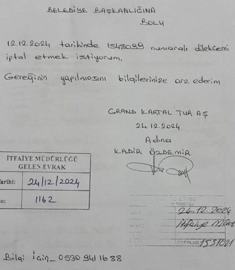 Ancak otel yönetimi 24 Aralık 2024 günü başvuruyu geri çekme kararı alıp, dilekçe veriyor. Evrakta işletmenin 3224 metrekarelik alan için istediği yangın raporunu, bu kez 3224 metrekarenin üzerine çizerek, 70 metrekareye düşürdüğü görülüyor.