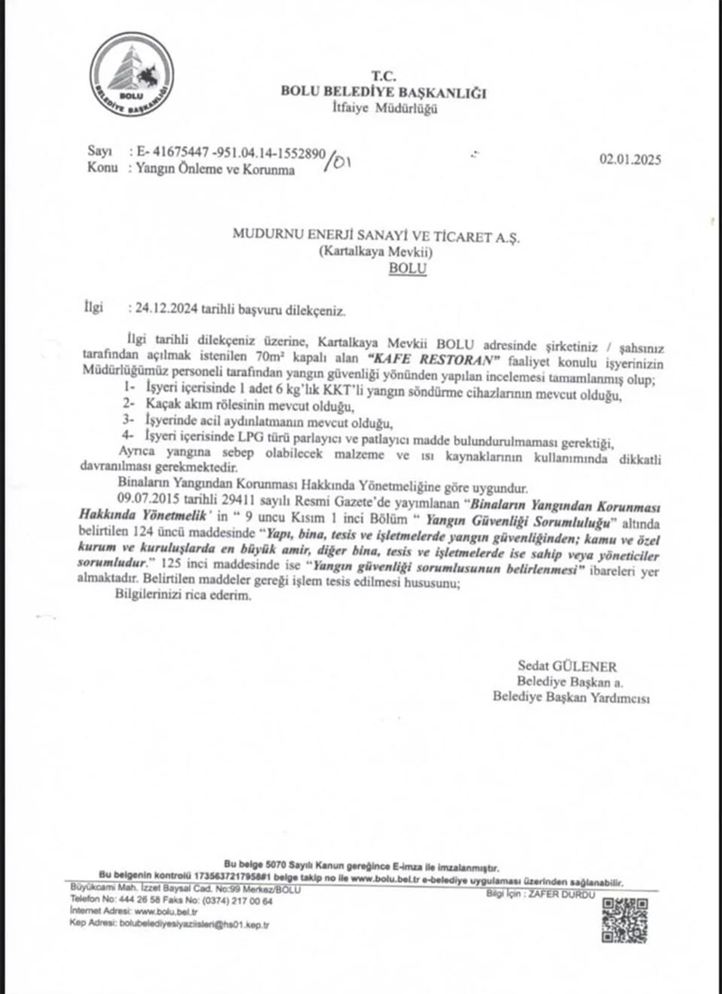 Ortaya çıkan iki rapordan ilki 12 Aralık 2024 tarihine ait. Söz konusu başvuru dilekçesi ve rapora göre, Grand Kartal Otel yetkilileri, Bolu Belediyesi’ne başvuruda bulunarak otel binası için yangın yeterlilik belgesi istiyor.