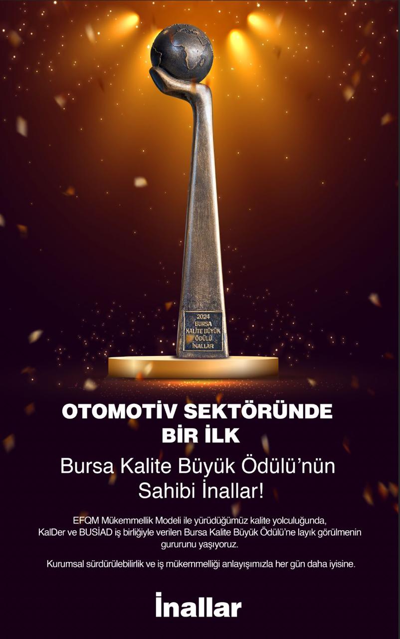 KalDer ve BUSİAD iş birliğiyle düzenlenen Bursa Kalite ve Süreklilik Ödülleri kapsamında, İnallar, Bursa Kalite Büyük Ödülü’nün sahibi oldu. Kurumsal sürdürülebilirliği ve iş mükemmelliği konusundaki kararlılığıyla dikkat çeken İnallar, bu prestijli ödül ile kalite yolculuğundaki başarısını bir kez daha tescillemiş oldu.