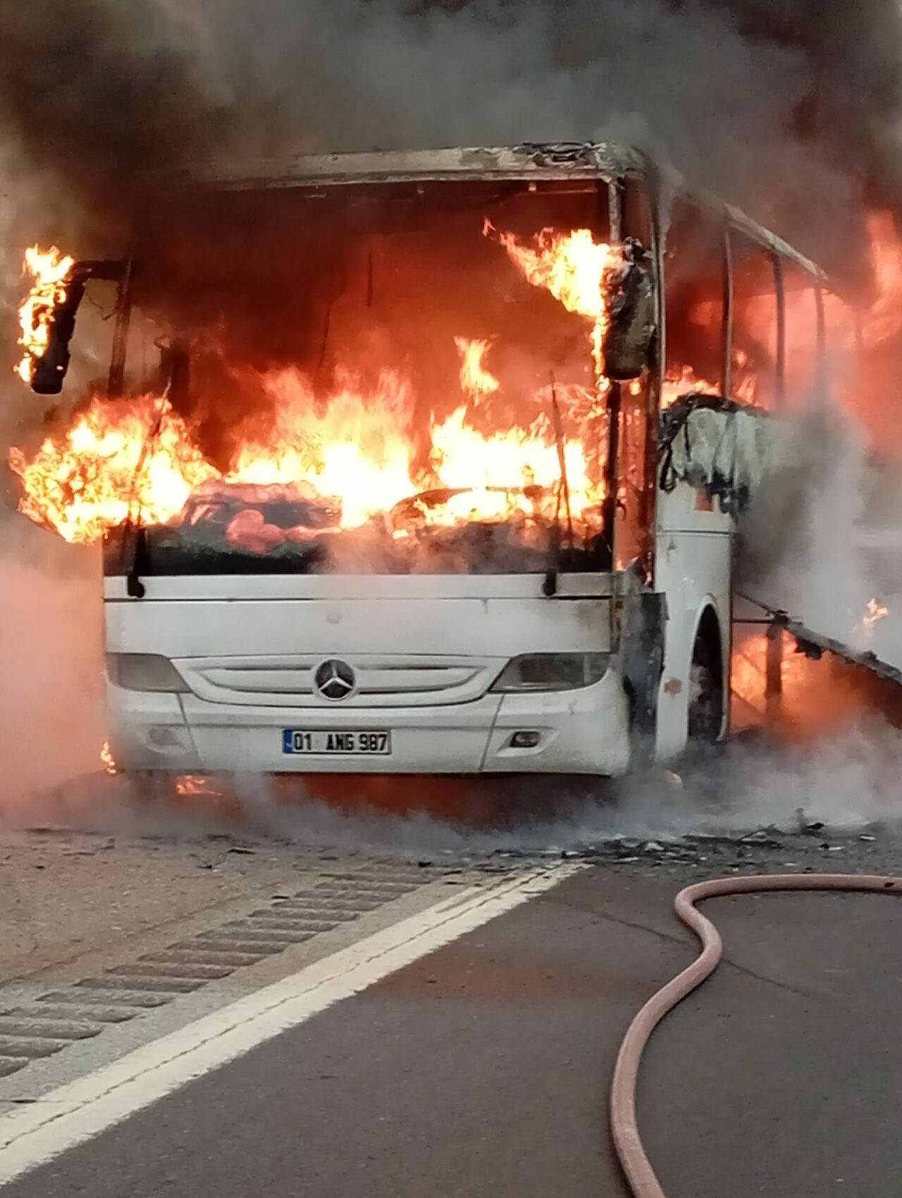 Samsun’dan Adana’ya giden S.S. yönetimindeki 01 ANG 987 plakalı yolcu otobüsü Damlama mevkisine geldiğinde motor kısmından alev aldı.