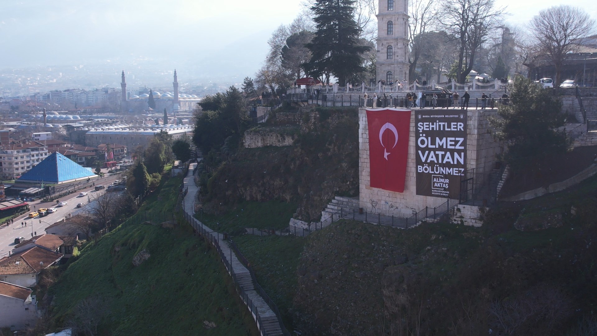 Belediye tarafından Osmanlı İmparatorluğu’nun kurucusu Osmangazi ve oğlu Orhangazi’nin türbelerinin bulunduğu 2700 yıllık Tophane surlarına Türk Bayrağı ve üzerinde “Şehitler ölmez vatan bölünmez” yazılı pankart asıldı. Bursa’nın önemli bir kısmından görülen pankart havadan görüntülendi.