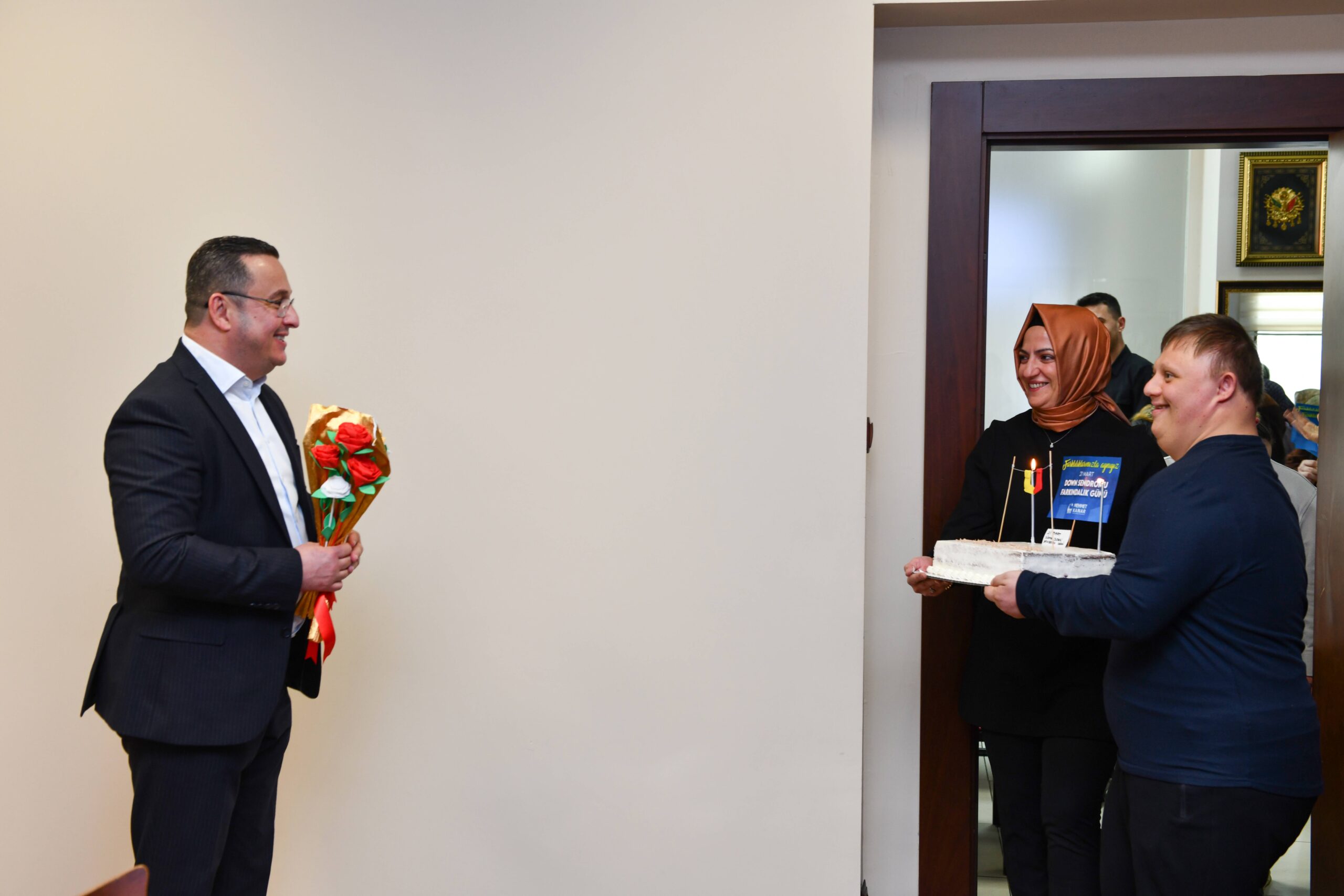 Down Sendromlu çocuklar ve Belediye Başkanı Mehmet Kanar’ın eşi Yasemin Kanar ile birlikte ellerinde pasta ile makamı ziyaret ettiler. Başkan Kanar’a unutamayacağı bir sürpriz hazırladılar. Başkan Kanar ve özel çocukların arasında ki sohbetler yürekleri ısıttı.