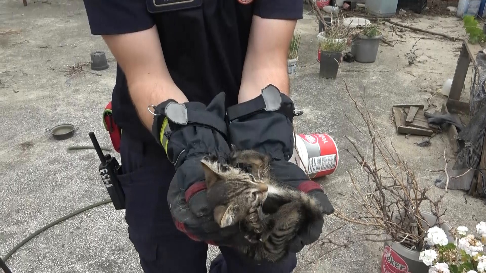 İtfaiye ekiplerini evlerinin balkonlarından yönlendiren mahalle sakinleri, kedi ile itfaiye eri arasında geçen kovalamacayı da izlemeyi ihmal etmedi. Kedilerden birisi, itfaiye eri tarafından yakalanırken diğeri adeta itfaiyeci ile saklambaç oynadı. Telefonundan kedi sesi açan itfaiye eri saklanan kediyi bulamadı. İtfaiye eri, saklanan kediyi bulamasa da yaralı kediyi alarak sahibine teslim etti. Kedi sahibi, itfaiye ekiplerine teşekkür etti.