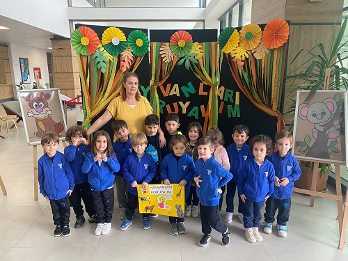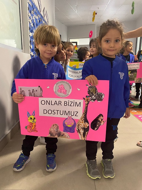 Özel Teknoloji Fen Koleji anaokulu ve 1.sınıf öğrencileri 4 Ekim Hayvanları Koruma Günü ile ilgili hazırladıkları hayvan maskeleri ve hayvan sevgisini yansıtan pankartlarla okul koridorlarında ve bahçesinde farkındalık yürüyüşü yaptılar.