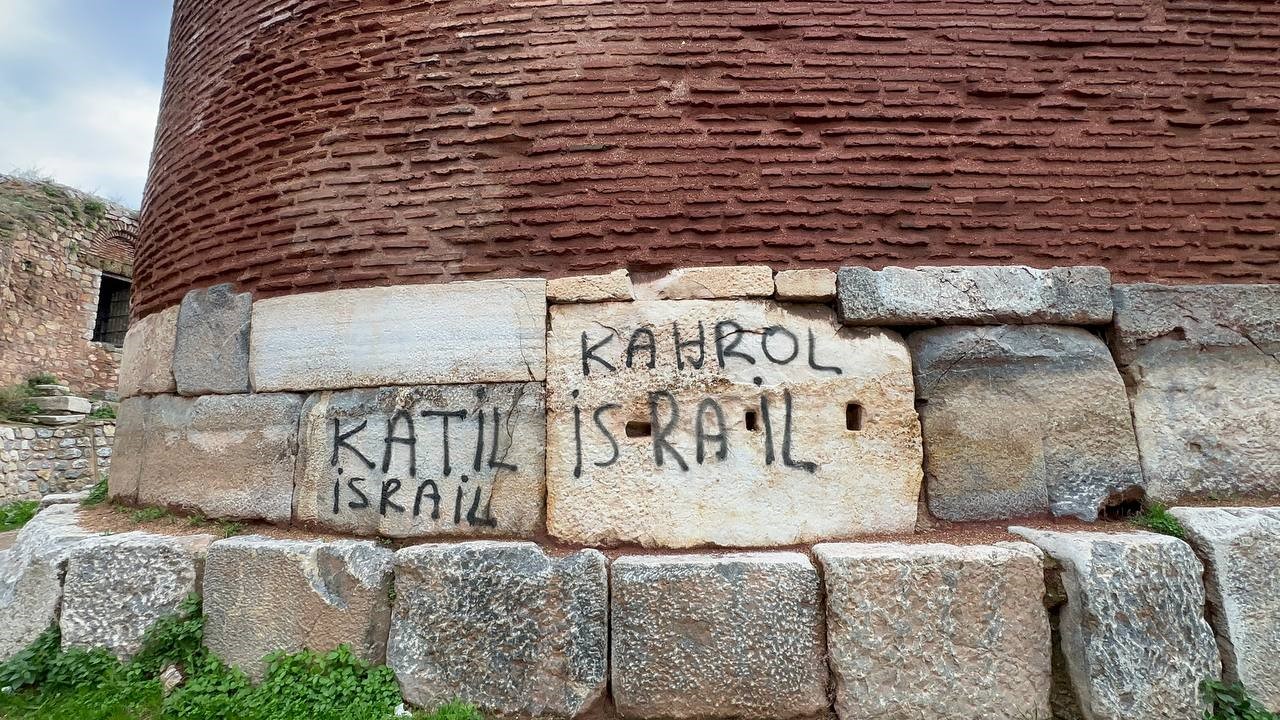 Bizans, Roma, Osmanlı ve Selçuklu olmak üzere 4 medeniyete başkentlik yapmış Bursa’nın İznik ilçesinde şehir merkezini çevreleyen 2 bin 500 yıllık tarihi surların Lefke kapı bölümünde kimliği belli olmayan kişiler sprey boyalar ile İsrail’i boykot edip, nefretlerini surların üzerine “Katil İsrail” yazarak dile getirdi. Vatandaşlar ise kimliği belirsiz kişilerin sura yazı yazdığı o anı fotoğrafladı. Tarihi surlara “Kahrol İsrail Katil İsrail” yazan kişilerin kim olduğu bilinmiyor. Bölgeye gelen turistler ise boykotu destekliyor ama yerinin burası olmadığını söylüyor.