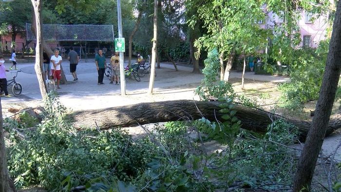 Çocukların oyun oynadığı, sokak sakinlerinin de banklarda oturduğu sırada 20 yıllık ağaçtan sesler gelmeye başladı. Altında oturanlar kaçarken, ağaç eğildikten sonra kökünden sökülerek tamamen devrildi.