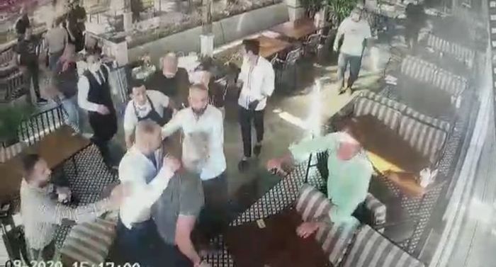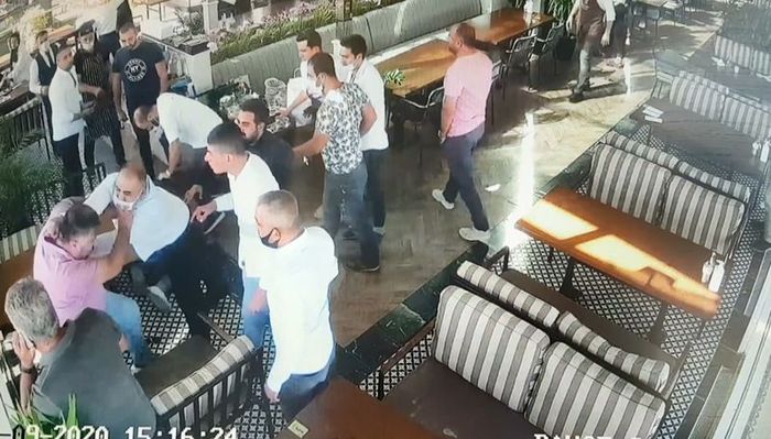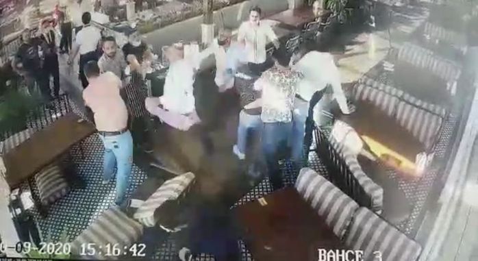 Bir süre sonra ayağa kalkan iki grup arasında tekmeli-yumruklu kavga çıktığı, restoran çalışanlarının kavgayı ayırmaya çalıştığı kameraya yansıyor.