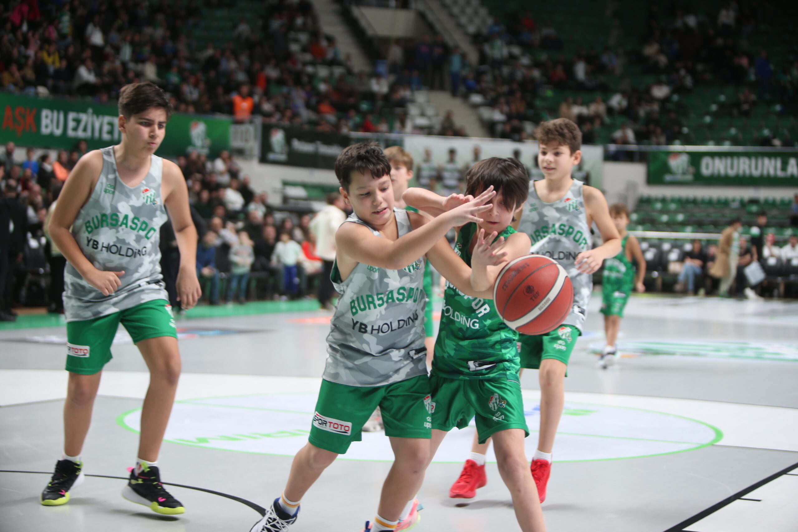 Bursaspor Basketbol altyapısında eğitim gören geleceğin basketbolcuları, Bursaspor İnfo Yatırım-Aliağa Petkimspor maçının devre arasında parkeye çıkarak hünerlerini sergiledi. Kendi aralarında mini bir maç yapan Bursaspor Basketbol altyapı sporcuları gösterdikleri performansla taraftarlardan alkış aldı.