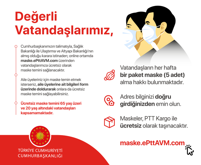Cumhurbaşkanımız’ın talimatıyla, Sağlık ve Ulaştırma Altyapı Bakanlığı’nın koordinasyonunda 20-65 yaş arası vatandaşlarımıza maske dağıtılacaktır. maske.epttavm.com adresindeki formu dolduran her vatandaşımızın evine haftada 5 adet maske teslim edilecektir.