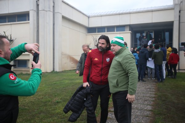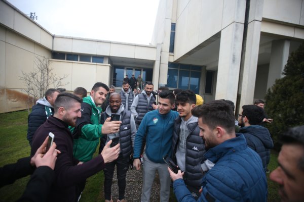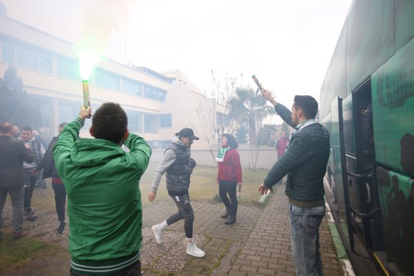 Bursaspor, ligde yarın Büyükşehir Belediye Erzurumspor’la oldukça kritik bir sınava çıkacak. Rakibini yenerek hem ikincilik koltuğuna oturmak hem de Süper Lig yolunda zorlu bir engeli daha aşmak isteyen yeşil beyazlıları bir grup taraftarla birlikte Frutti Extra Bursaspor Basketbol Takımı oyuncuları yolcu etti. Zorlu mücadele öncesinde tesislere gelen 50 kişilik yeşil beyaz sevdalısı futbolcu ve teknik ekibe sevgi gösterisinde bulunurken, zorlu maçta başarı dileklerinde bulundu.