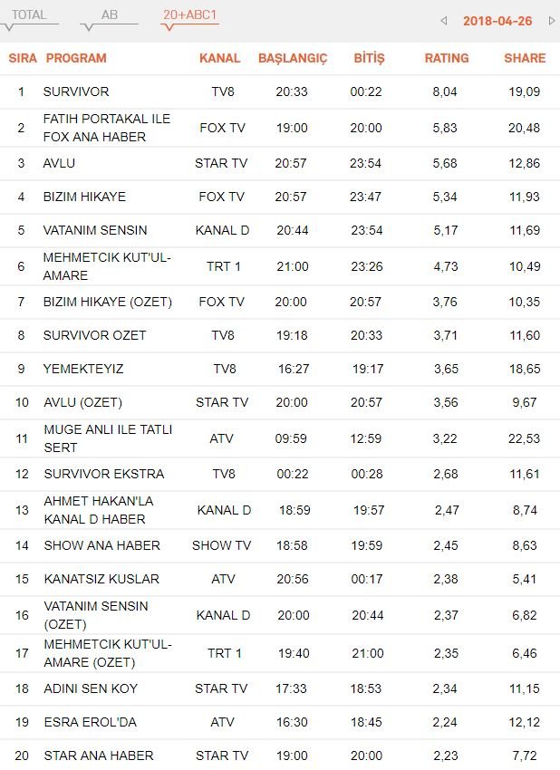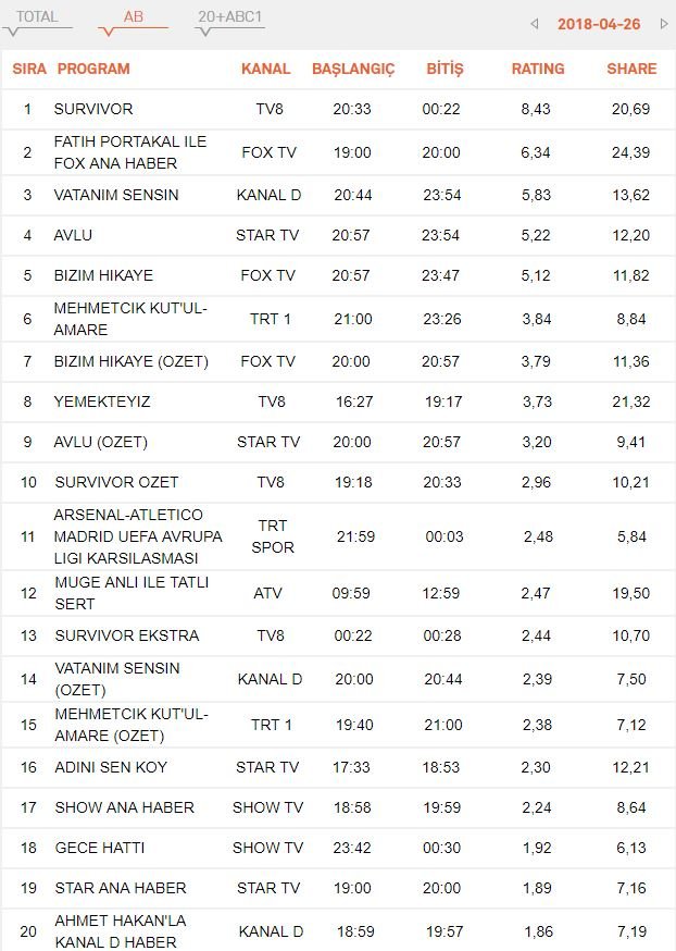 AB’de ise Survivor birinci sırada yer alırken, ikincilik Fatih Portakal ile Fox Ana Haber’in, üçüncülük ise Kanal D’de yayınlanan Vatanım Sensin dizisinin oldu.